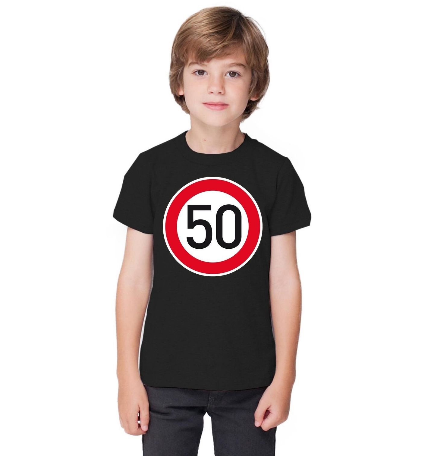 Dětské tričko Nejvyšší dovolená rychlost 50. Design inspirovaný dopravní značkou “Nejvyšší dovolená rychlost” s číslem „50“, která je zobrazena v typickém kruhu s červeným okrajem a bílým středem. Černé číslo 50 dominuje celému motivu a symbolizuje rychlostní limit, věk nebo milník. Vhodný dárek pro oslavence k padesátinám.