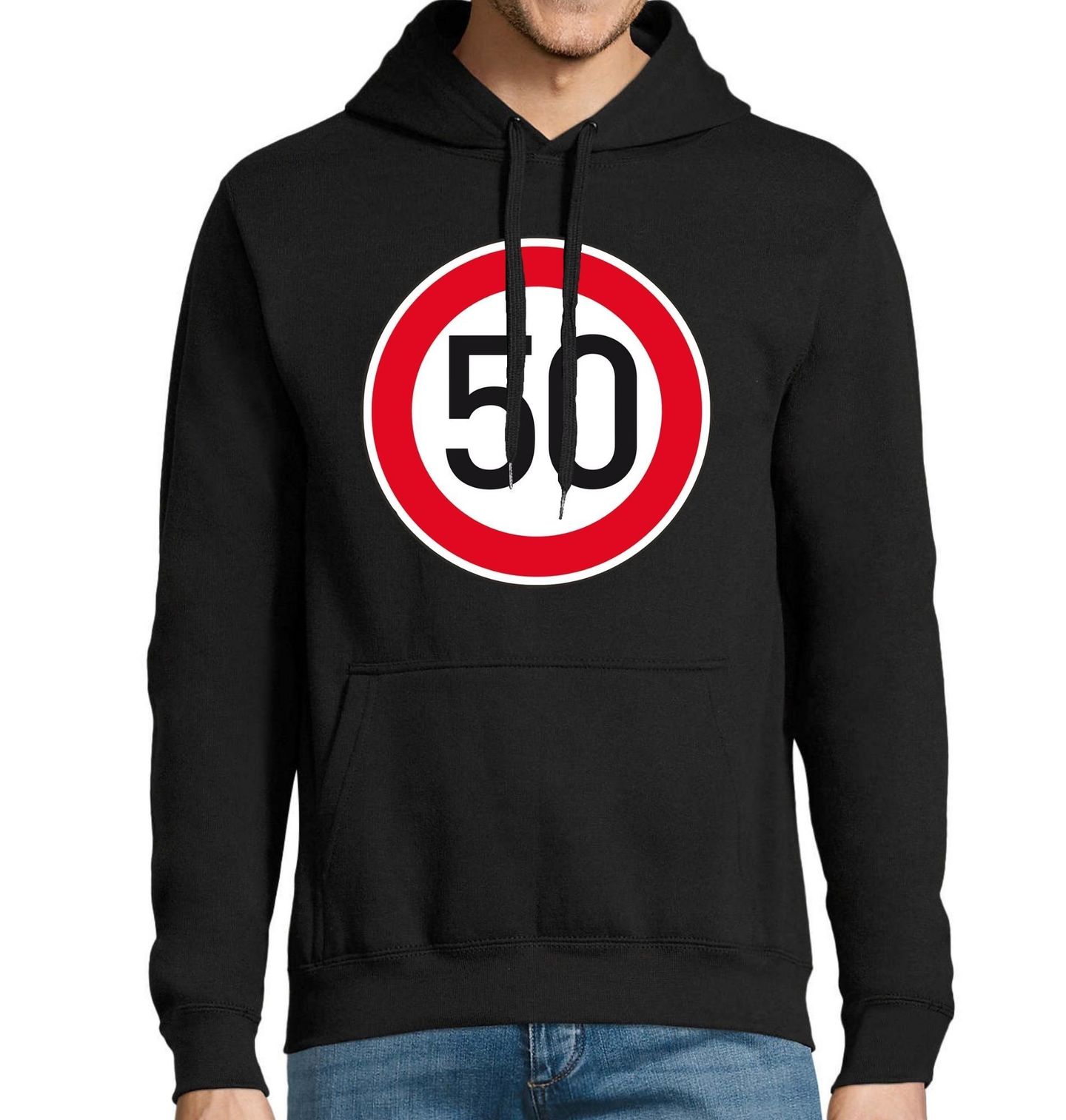 Pánská mikina Nejvyšší dovolená rychlost 50. Design inspirovaný dopravní značkou “Nejvyšší dovolená rychlost” s číslem „50“, která je zobrazena v typickém kruhu s červeným okrajem a bílým středem. Černé číslo 50 dominuje celému motivu a symbolizuje rychlostní limit, věk nebo milník. Vhodný dárek pro oslavence k padesátinám.