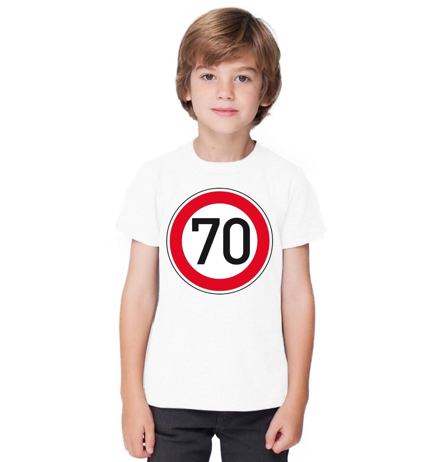 Dětské tričko Nejvyšší dovolená rychlost 70. Design inspirovaný dopravní značkou “Nejvyšší dovolená rychlost” s číslem „70“, která je zobrazena v typickém kruhu s červeným okrajem a bílým středem. Černé číslo 70 dominuje celému motivu a symbolizuje rychlostní limit, věk nebo milník. Vhodný dárek pro oslavence k sedmdesátinám.