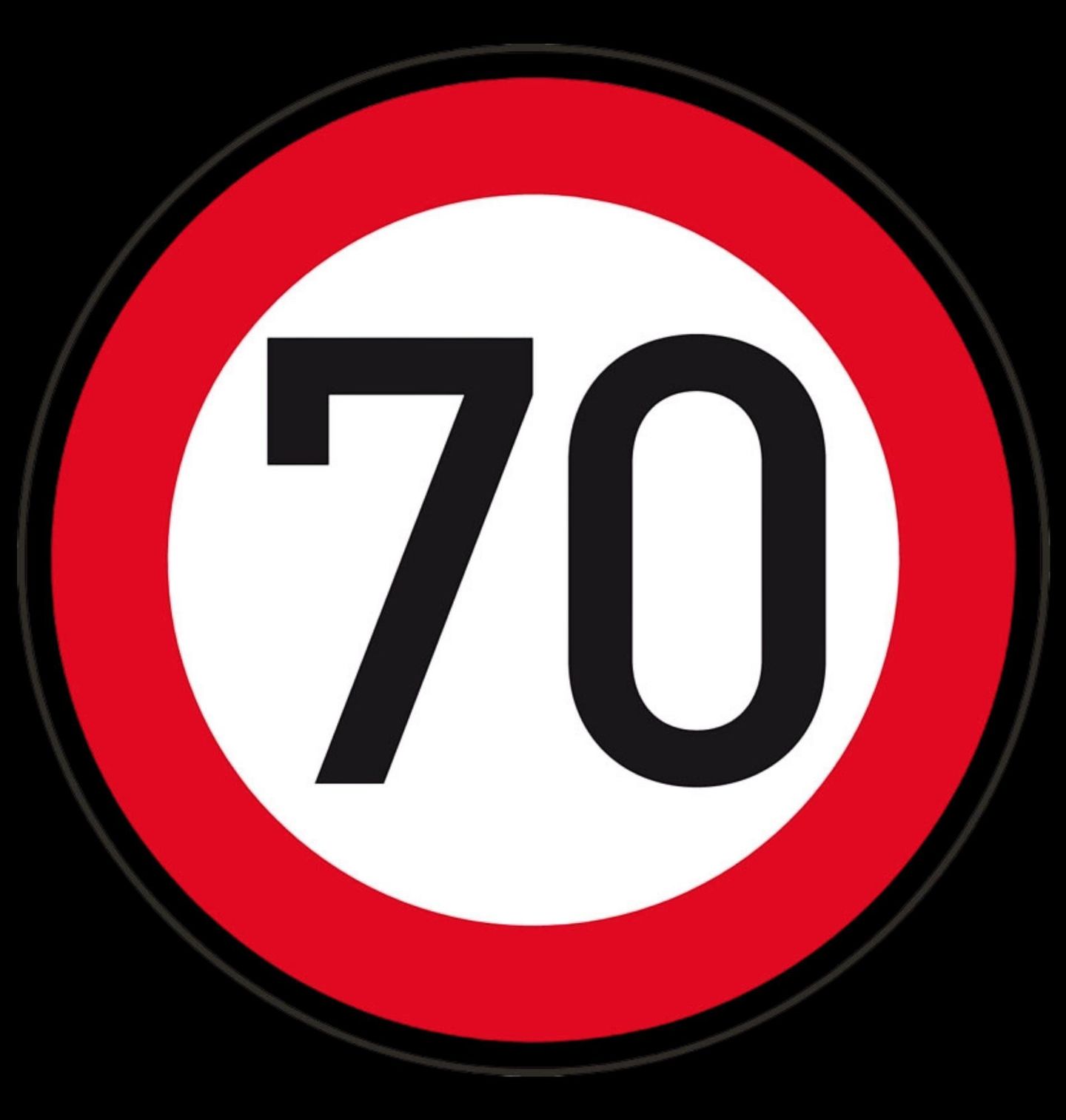 Pánské tričko Nejvyšší dovolená rychlost 70. Design inspirovaný dopravní značkou “Nejvyšší dovolená rychlost” s číslem „70“, která je zobrazena v typickém kruhu s červeným okrajem a bílým středem. Černé číslo 70 dominuje celému motivu a symbolizuje rychlostní limit, věk nebo milník. Vhodný dárek pro oslavence k sedmdesátinám.