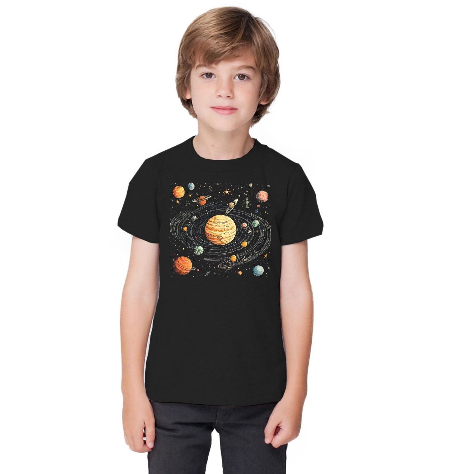 Dětské tričko Nekonečný Vesmír. Poutavý motiv, který zachycuje nekonečný vesmír plný barev, pohybu a tajemství. Ilustrace zobrazuje rozmanité planety obíhající v dynamickém víru, připomínajícím kosmický tanec, který nikdy nekončí. Každá planeta má svůj jedinečný charakter, což dodává celému designu hravost i hloubku. Planety v kombinaci s hvězdným pozadím vytvářejí jedinečnou atmosféru, která přenese vaši představivost do hlubin vesmíru.