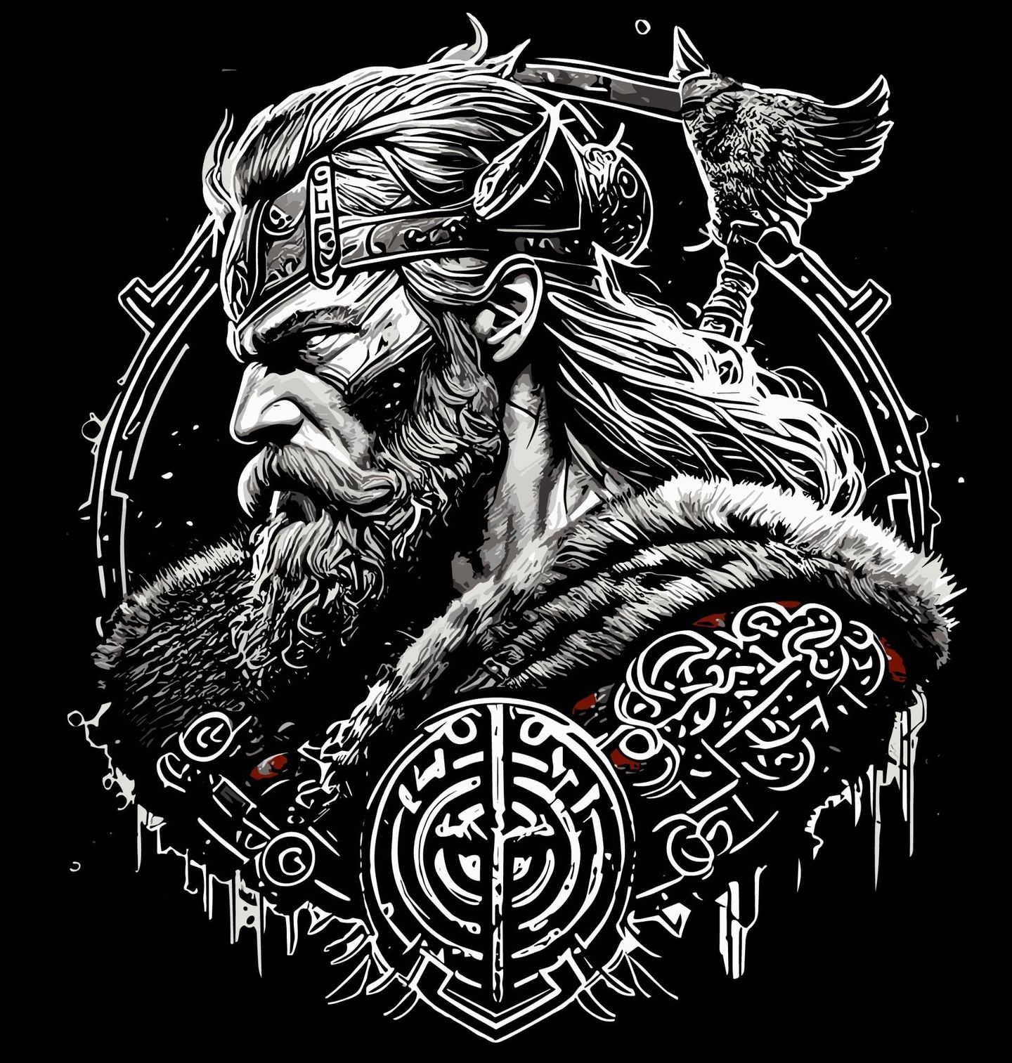 Dětské tričko Nelítostný Vikingský Válečník. Výrazný motiv zobrazující vikingského válečníka, symbol síly, cti a neústupnosti. Dlouhé vlasy, vousy, sekera a runové ornamenty odkazují na svět severu, kde viking žil podle zákonů boje, loajality a odvahy. Tento design představuje archetyp náčelníka a bojovníka, který vede svůj klan a čelí osudu bez strachu.