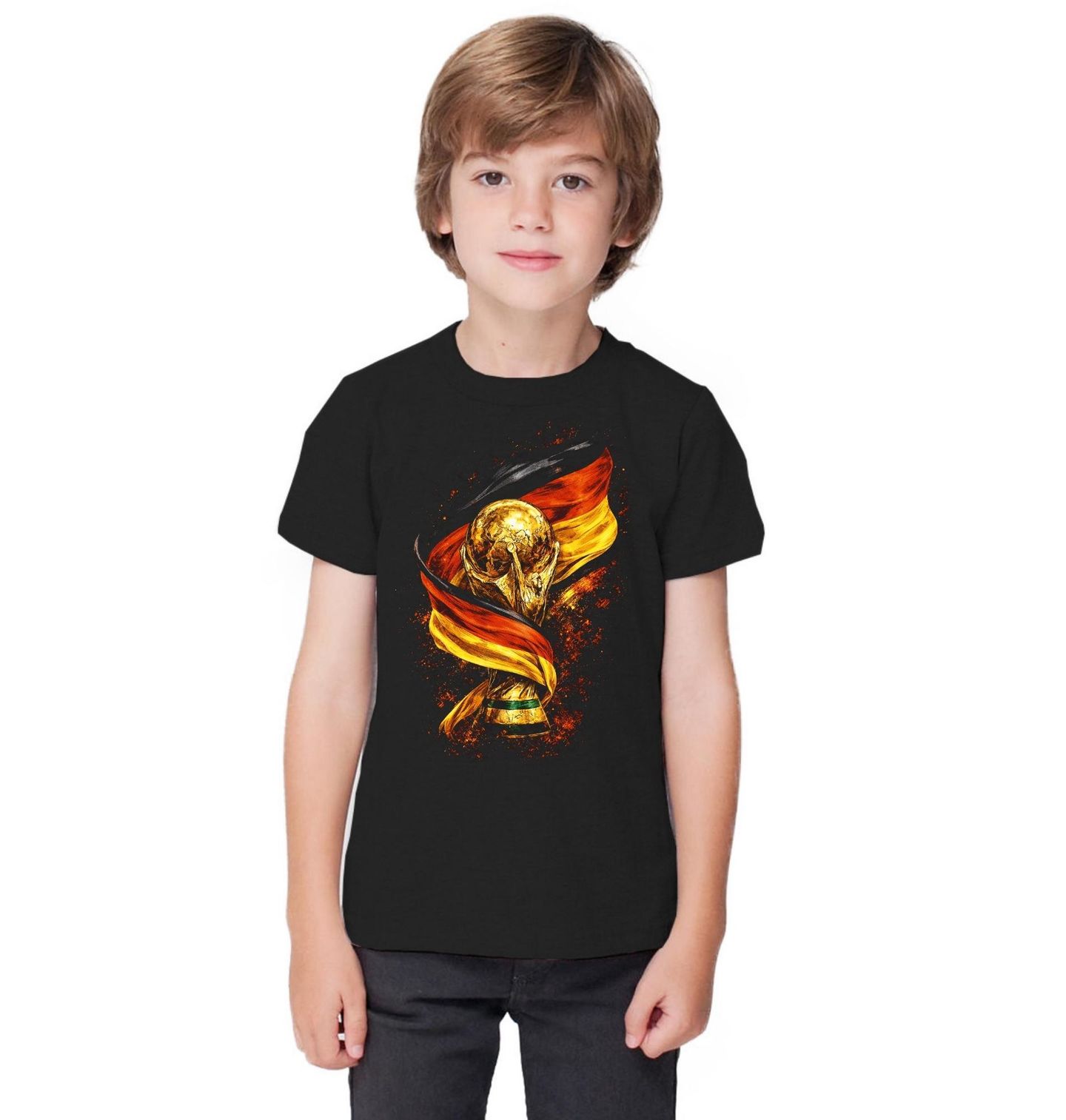 Dětské tričko Německá Trofej FIFA World Cup. Dynamický motiv zobrazuje ikonickou trofej Mistrovství světa ve fotbale zahalenou do vlajky Německa. Kombinace černé, červené a zlaté barvy symbolizuje tradici, sílu a vítěznou historii německého fotbalu. Zlatý pohár v kontrastu s energickým pozadím vytváří výrazný design, který zaujme každého fanouška, který miluje Německo.