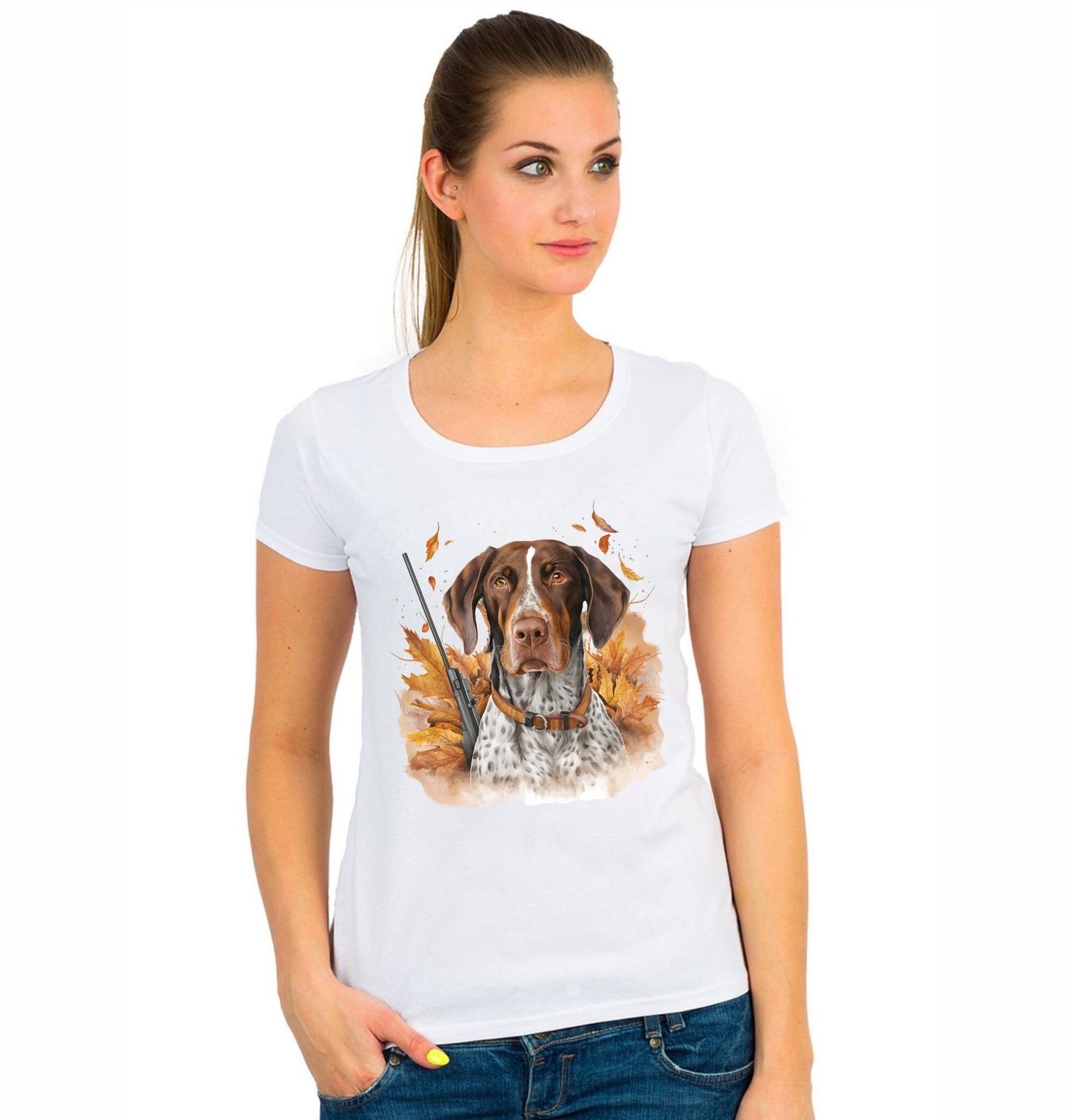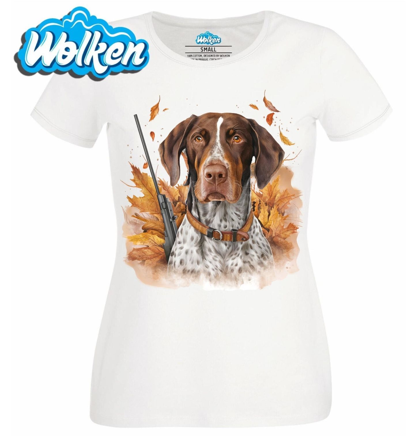 Dámské tričko Německý ohař krátkosrstý Podzimní stopař. Lovecký pes v podzimním lese plném listí s puškou po boku symbolizuje nejen oddaného psa, ale i spolehlivého parťáka každého pejskaře. Perfektní volba pro fanoušky loveckých plemen, stylu a jedinečného designu.