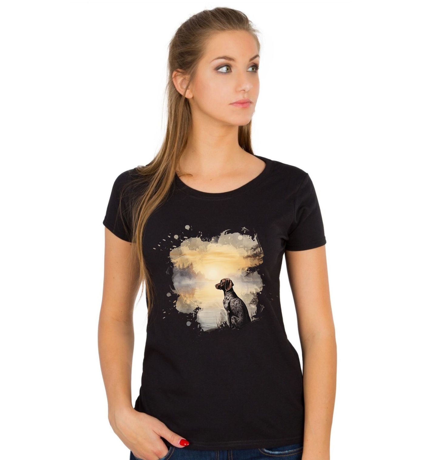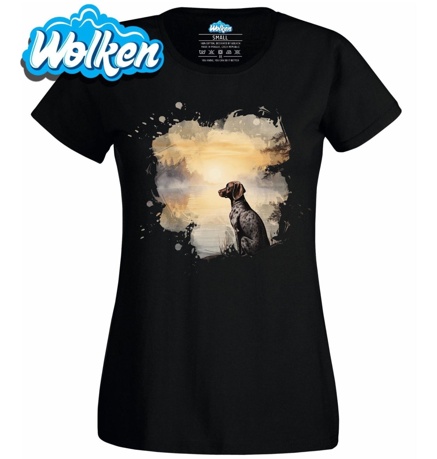 Dámské tričko Německý ohař krátkosrstý u Jezera. Německý ohař krátkosrstý sleduje západ slunce nad klidnou hladinou jezera. Tento obraz je oslavou spojení člověka, přírody a věrného společníka, kterým je právě tento pes. Perfektní volba pro každého pejskaře, který má rád přírodu, lovecká plemena a momenty ticha.