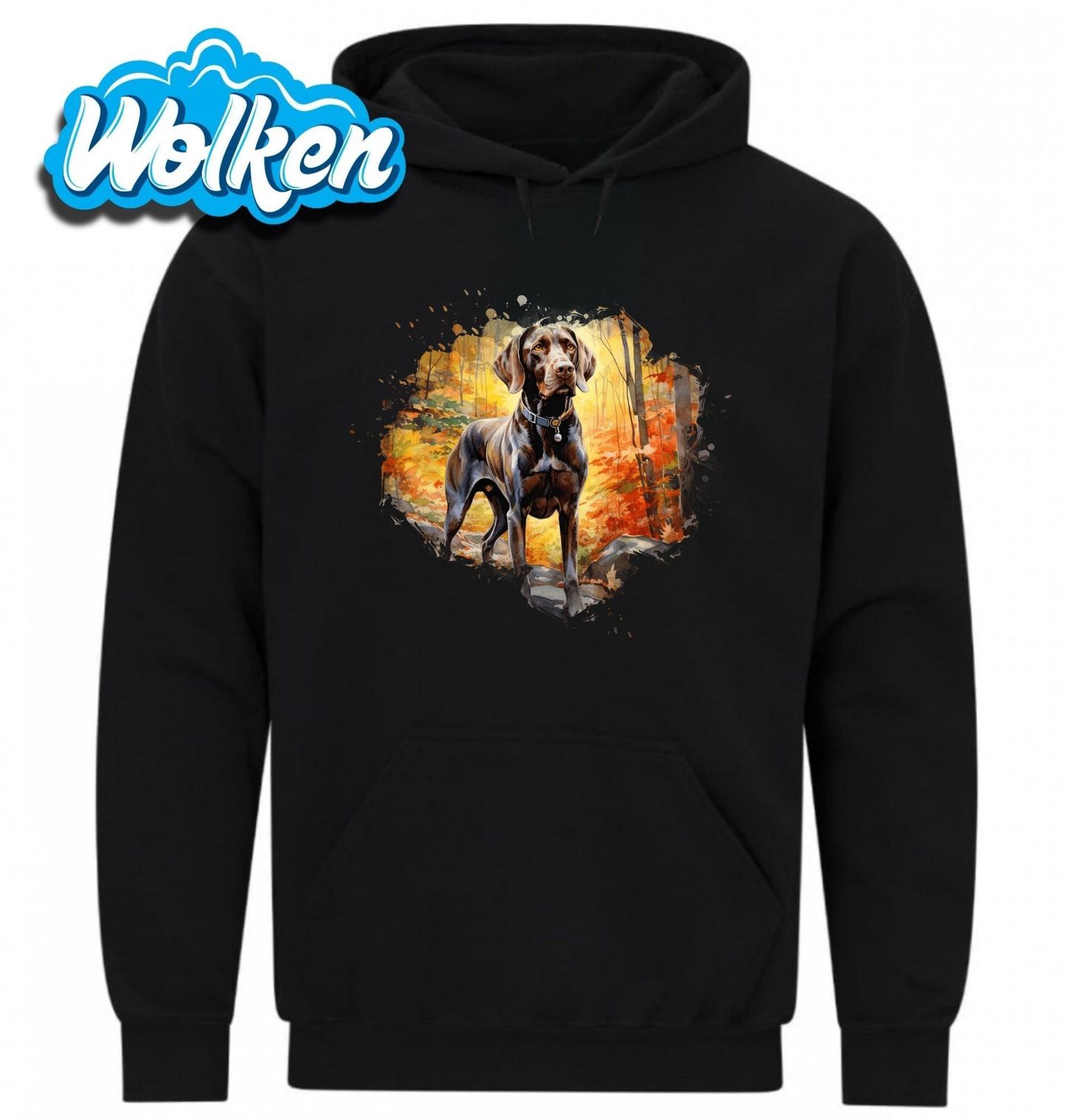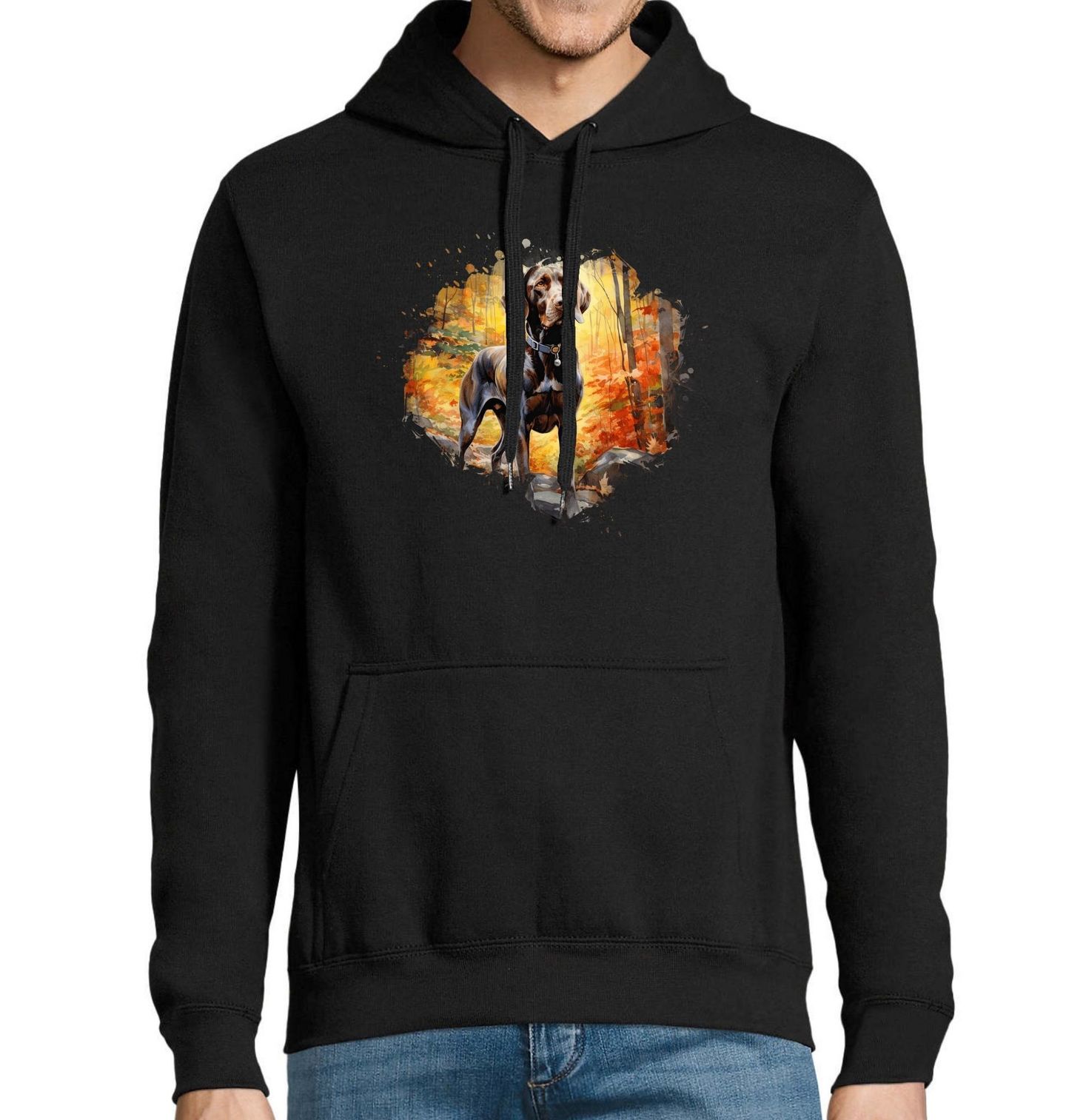 Pánská mikina Německý ohař krátkosrstý v Podzimním Lese. Krásný motiv zachycující elegantní sílu a bdělost plemene Německý ohař krátkosrstý uprostřed podzimního lesa. Tento pes s hlubokým pohledem a hrdým postojem je nejen lovec, ale i věrný parťák každého pejskaře, který miluje přírodu a dlouhé procházky.