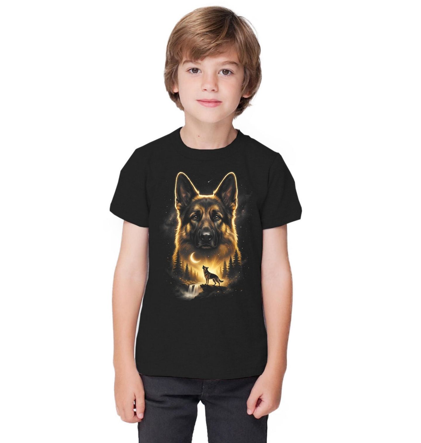 Dětské tričko Německý Ovčák a Kouzlo Úplňku. Tento mystický motiv zachycuje psa plemene německého ovčáka vyjícího v magické noční krajině zalité světlem úplňku. Silueta lesa, vodopád a zářící měsíc vytvářejí tajemnou atmosféru, která podtrhuje sílu, věrnost a inteligenci tohoto ikonického plemene.