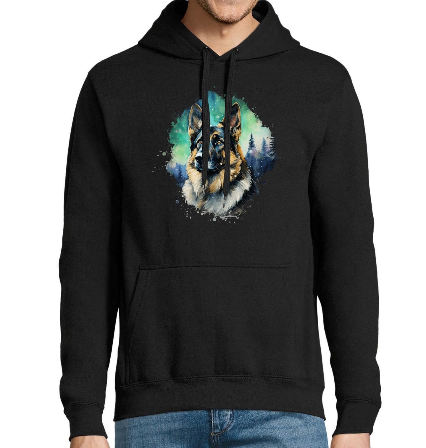 Pánská mikina Německý ovčák pod Noční Oblohou. Tričko s motivem německého ovčáka pod hvězdnou noční oblohou je ideální volbou pro každého milovníka psů. Tento pes v pohledu skrývá oddanost, sílu a klid – vlastnosti, které každý správný pejskař dobře zná. Detailní akvarelová ilustrace s noční krajinou vytváří působivou kombinaci elegance a lásky ke zvířatům i přírodě.