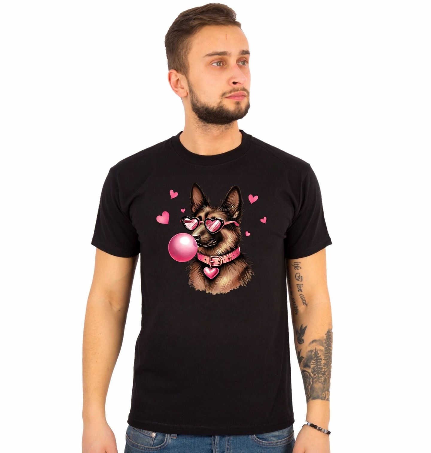 Pánské tričko Německý ovčák se Žvýkačkou. Originální motiv zachycuje Německý ovčák v růžových brýlích se srdíčky a bublinou z žvýkačky – kombinace síly, elegance a hravosti v jednom. Tento pes je symbolem věrnosti a odvahy, ale zároveň dokáže ukázat i svou něžnou stránku. Každý pejskař, který miluje plemeno Německý ovčák, si v tomto motivu najde to své.