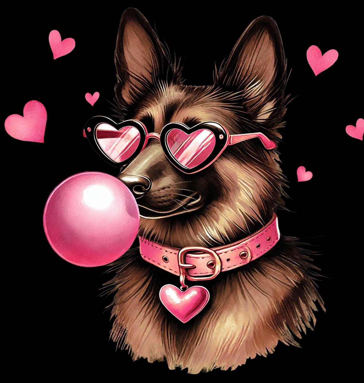 Dámské tričko Německý ovčák se Žvýkačkou. Originální motiv zachycuje Německý ovčák v růžových brýlích se srdíčky a bublinou z žvýkačky – kombinace síly, elegance a hravosti v jednom. Tento pes je symbolem věrnosti a odvahy, ale zároveň dokáže ukázat i svou něžnou stránku. Každý pejskař, který miluje plemeno Německý ovčák, si v tomto motivu najde to své.