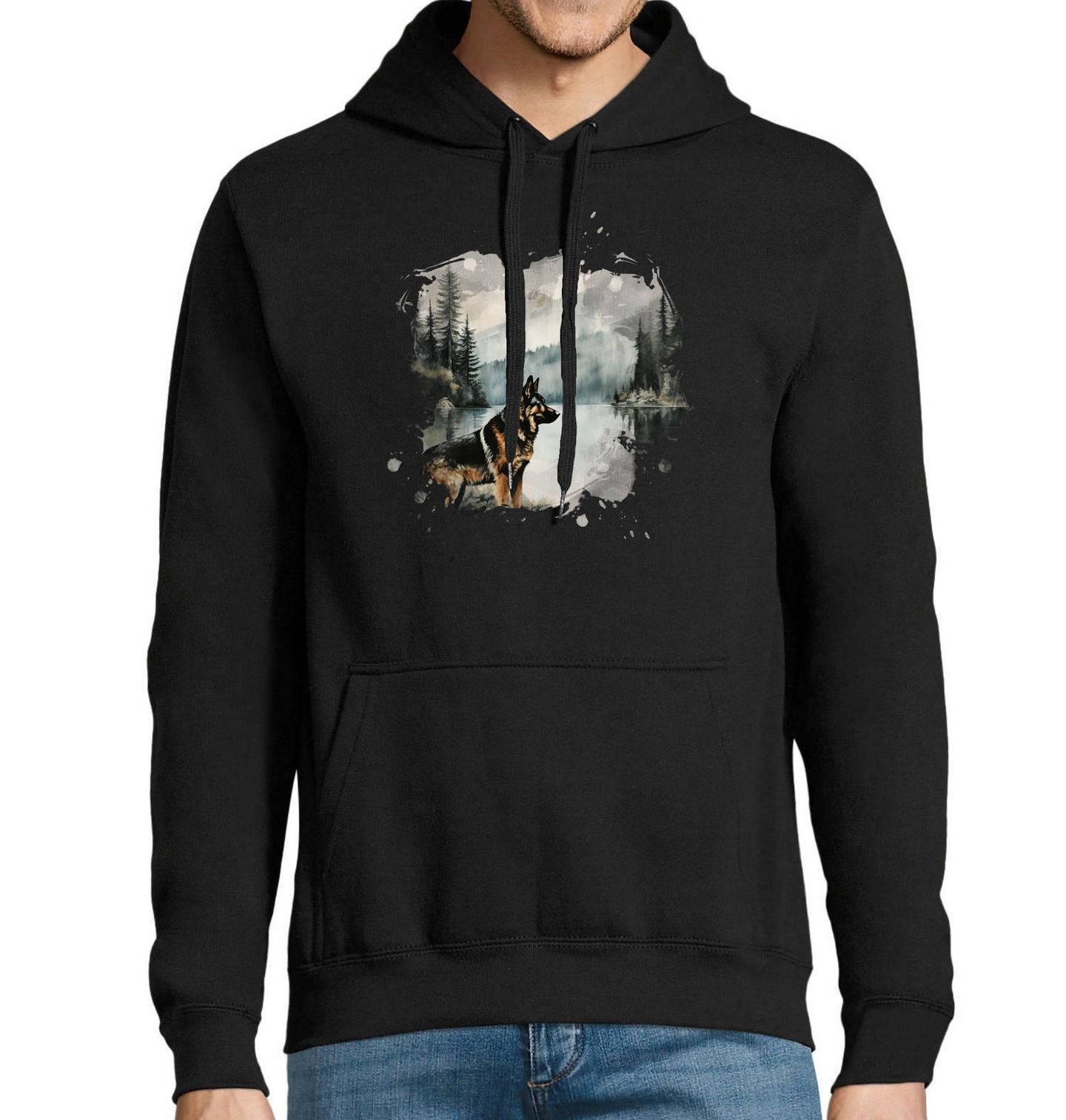 Pánská mikina Německý ovčák u Jezera. Tričko s motivem německého ovčáka stojícího u tichého horského jezera zachycuje sílu, klid a oddanost tohoto ušlechtilého plemene. Každý pejskař ocení detailní umělecké zpracování a přírodní atmosféru motivu. Tento pes v nádherné scenérii připomíná spojení člověka se zvířetem i přírodou.