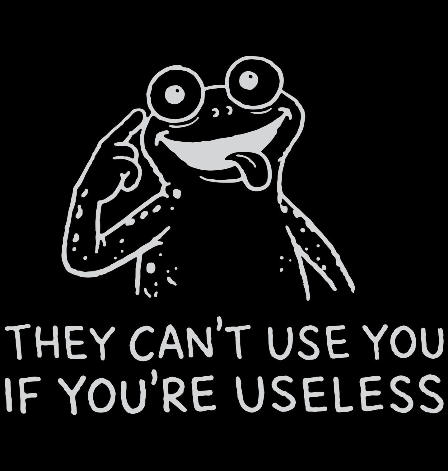 Dámské tričko Nemůžou tě využít, když jsi k ničemu. Hlavní postavou je stylizovaná žába s bláznivým výrazem, která doplňuje sarkastický text: „They can’t use you if you’re useless“. Tento design perfektně vystihuje ironický humor internetu a funguje jako originální meme, které pobaví i lehce provokuje.