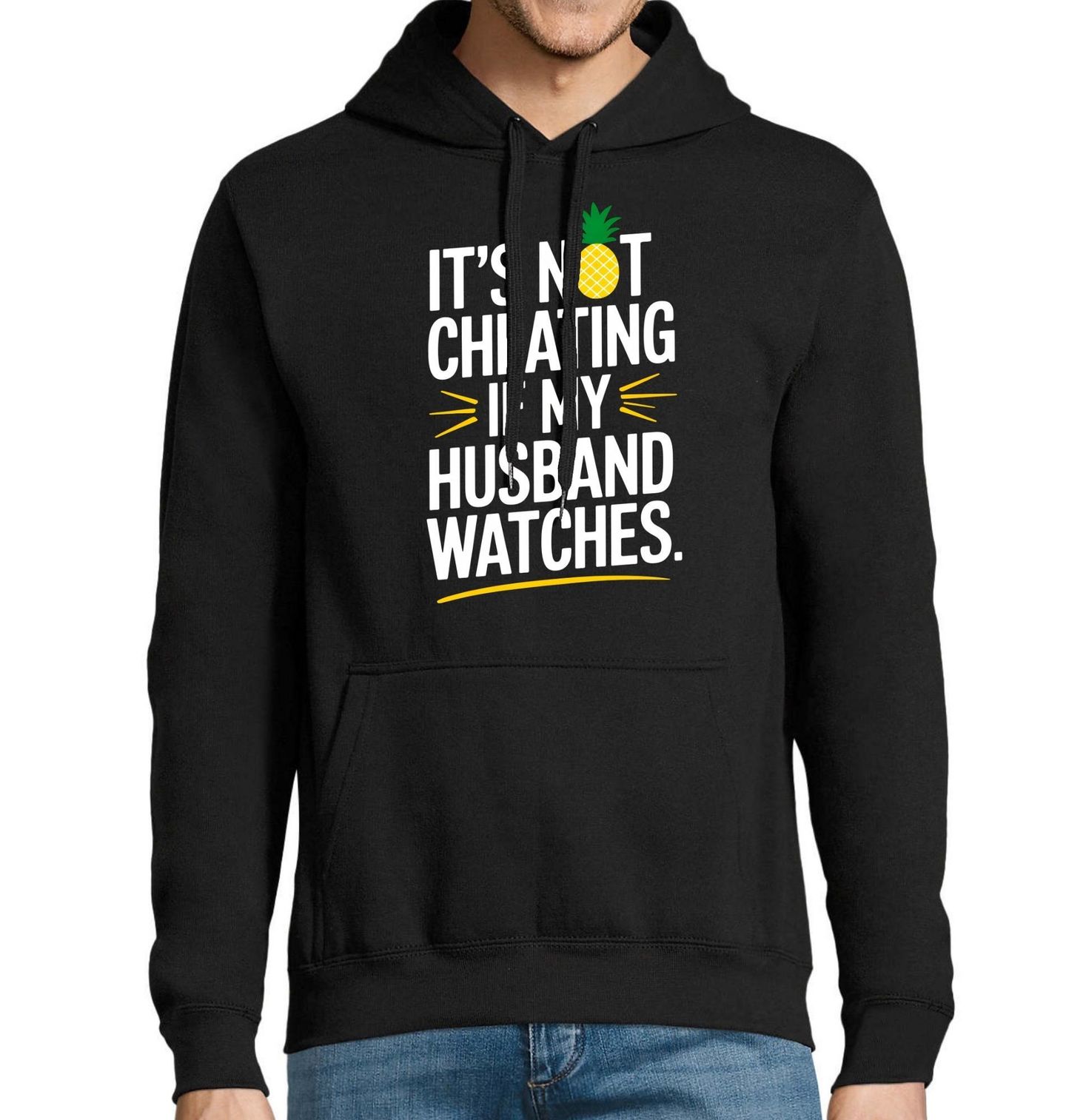 Pánská mikina Není to nevěra, když se můj manžel dívá. Humorný design s nápisem „IT’S NOT CHEATING IF MY HUSBAND WATCHES.“ přináší odlehčený pohled na manželství a partnerské vztahy. Překlad textu zní: „Není to nevěra, když se můj manžel dívá,“ což dělá z tohoto motivu odvážný a zábavný kousek pro ty, kdo mají smysl pro humor. Motiv skvěle vystihuje nadsázku a hravost, která může být součástí každého manželství.