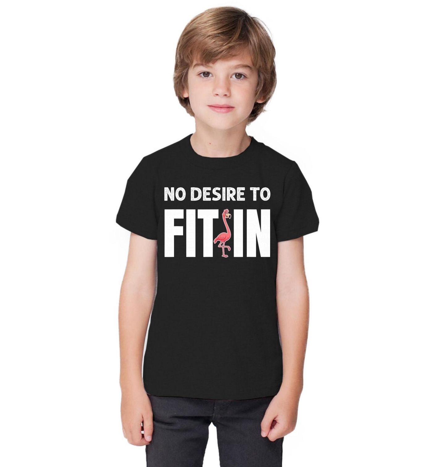 Dětské tričko Není třeba Zapadnout No Desire to Fit in. Výrazný design s textem „No desire to fit in“, tedy „Nemám potřebu zapadnout“, doplněný ilustrací plameňáka. Motiv vyjadřuje individualitu, sebevědomí a odvahu být jiný než ostatní – ideální design pro ty, kteří jdou vlastní cestou.