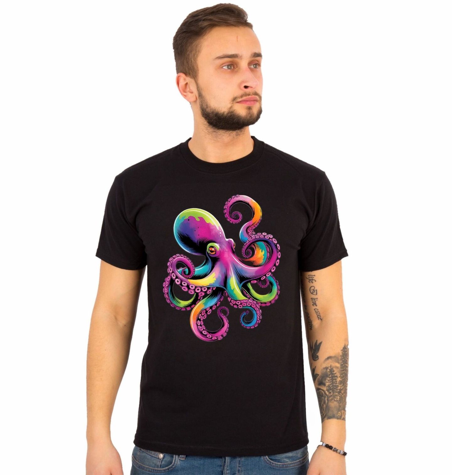 Pánské tričko Neonová Chobotnice. Tento výrazný motiv zachycuje fascinující chobotnici v zářivých neonových barvách. Chobotnice rozprostírá svá chapadla v dynamické kompozici plné energie a uměleckého stylu. Design připomíná tajemný svět hlubokého oceánu a oslavuje krásu mořských tvorů v moderním, barevném provedení.