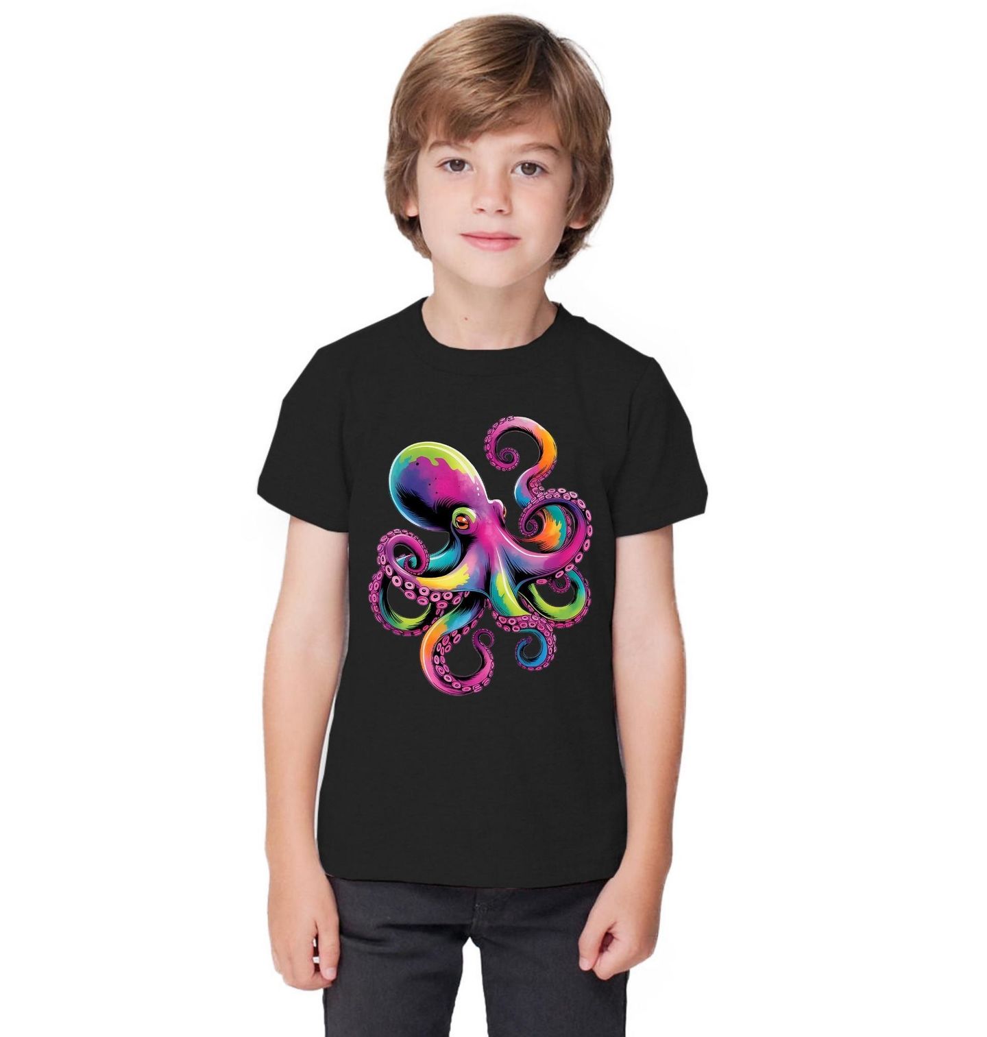 Dětské tričko Neonová Chobotnice. Tento výrazný motiv zachycuje fascinující chobotnici v zářivých neonových barvách. Chobotnice rozprostírá svá chapadla v dynamické kompozici plné energie a uměleckého stylu. Design připomíná tajemný svět hlubokého oceánu a oslavuje krásu mořských tvorů v moderním, barevném provedení.