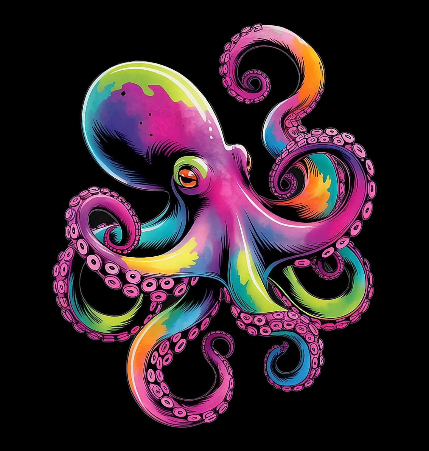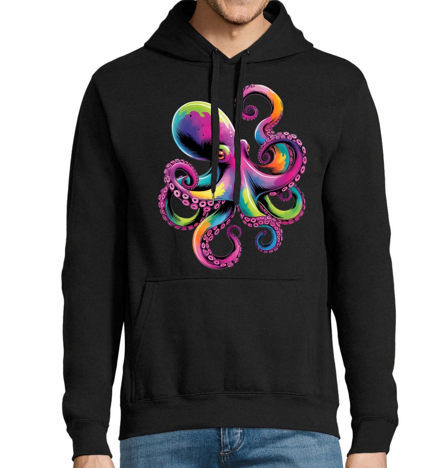 Pánská mikina Neonová Chobotnice. Tento výrazný motiv zachycuje fascinující chobotnici v zářivých neonových barvách. Chobotnice rozprostírá svá chapadla v dynamické kompozici plné energie a uměleckého stylu. Design připomíná tajemný svět hlubokého oceánu a oslavuje krásu mořských tvorů v moderním, barevném provedení.
