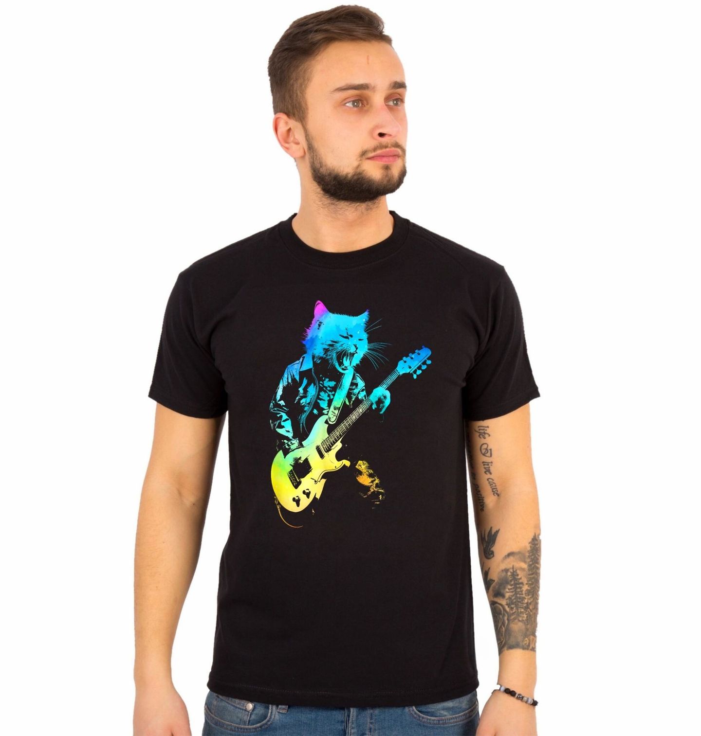 Pánské tričko Neonová Kočka na Pódiu. Výrazný a moderní motiv zachycuje divokou kočka jako skutečnou hudební hvězdu. V kožené bundě, s elektrickou kytarou v tlapkách a otevřenou tlamou v plném řevu zosobňuje čistý rock and roll. Neonové barevné přechody v odstínech modré, zelené a žluté vytvářejí efekt koncertního osvětlení a dodávají designu dynamiku noční show.