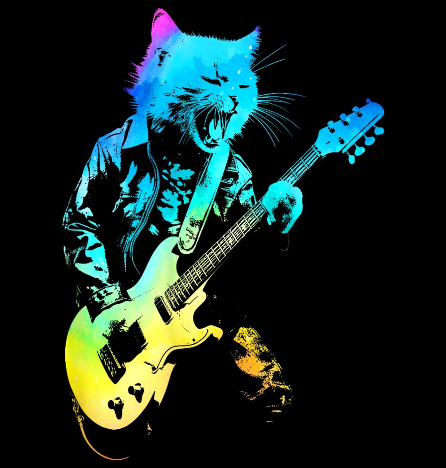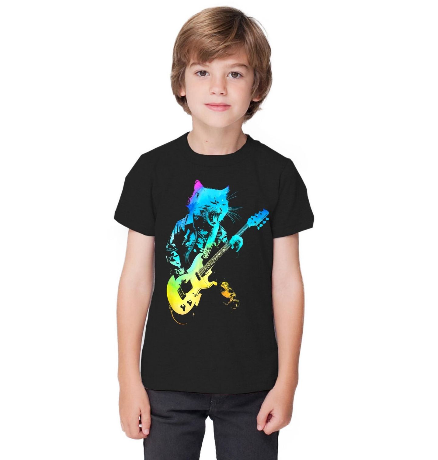 Dětské tričko Neonová Kočka na Pódiu. Výrazný a moderní motiv zachycuje divokou kočka jako skutečnou hudební hvězdu. V kožené bundě, s elektrickou kytarou v tlapkách a otevřenou tlamou v plném řevu zosobňuje čistý rock and roll. Neonové barevné přechody v odstínech modré, zelené a žluté vytvářejí efekt koncertního osvětlení a dodávají designu dynamiku noční show.