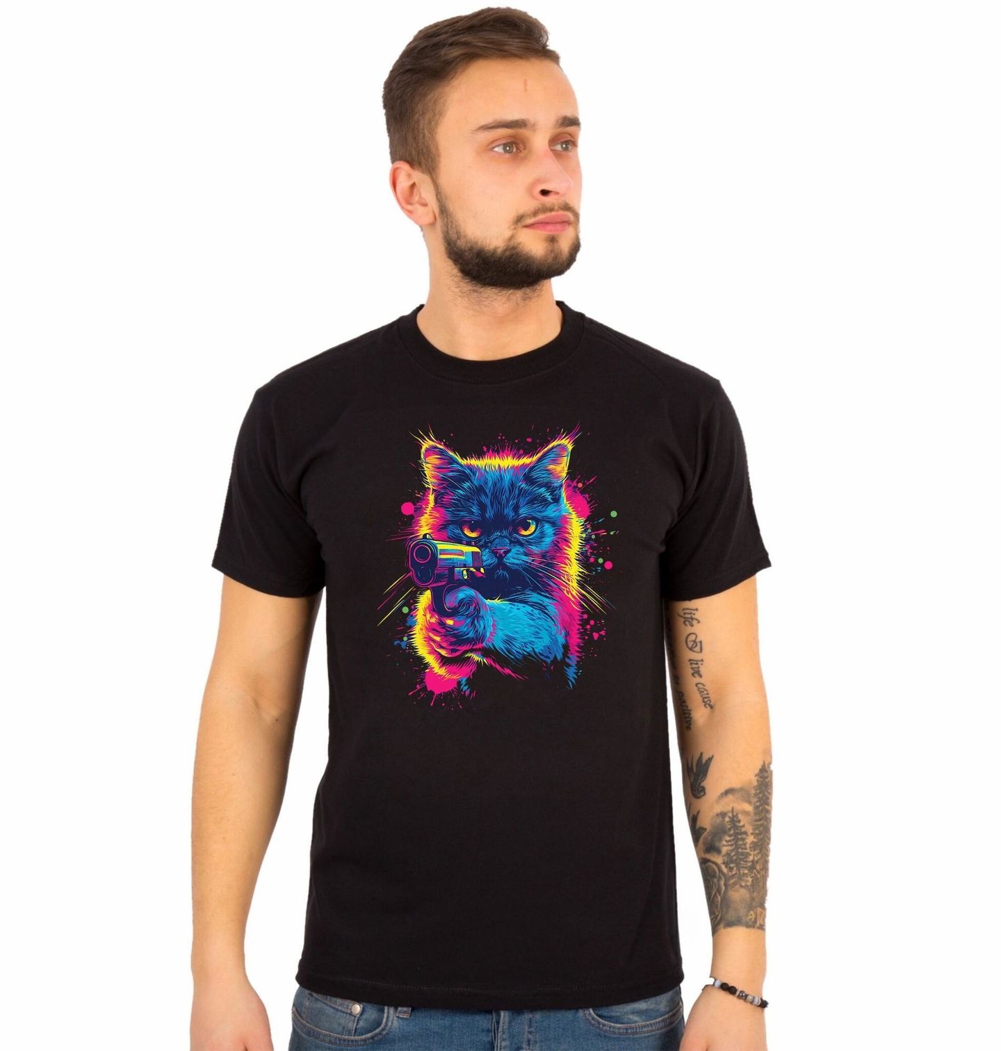 Pánské tričko Neonová Kočka s Pistolí. Výrazný motiv ve stylu neonového street-artu, na kterém je zachycena kočka v zářivých barvách, držící pistoli. Hlavním tématem je kočka a zbraně, zpracované s nadsázkou a komiksovým nádechem – proto se skvěle hodí pro fanoušky originální grafiky, kteří mají rádi trochu temného humoru.