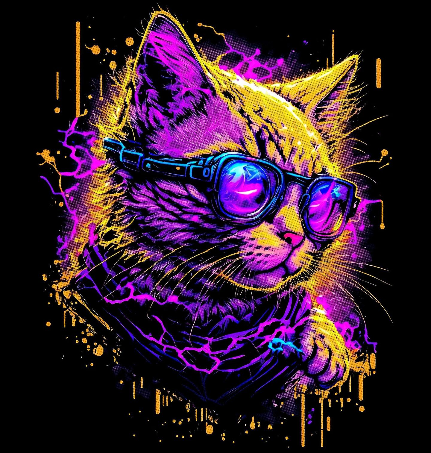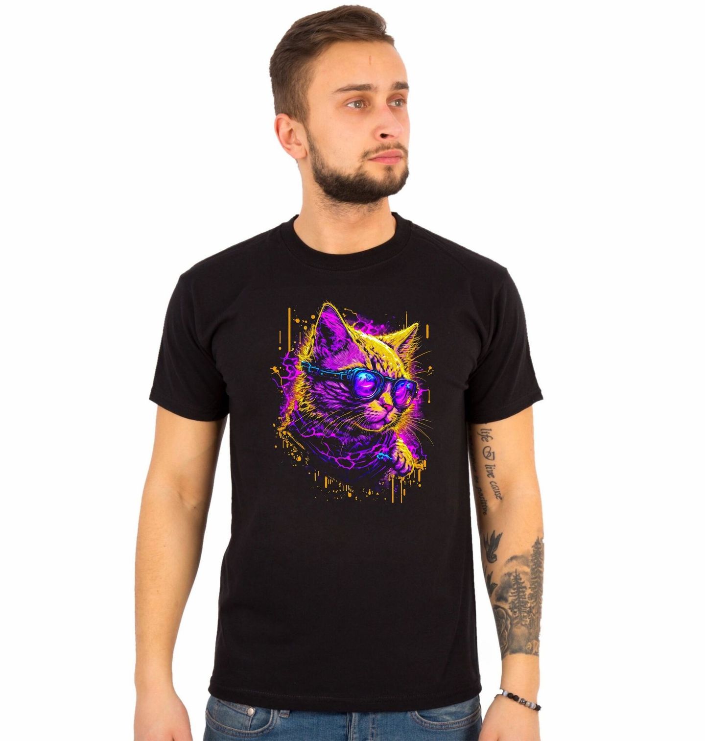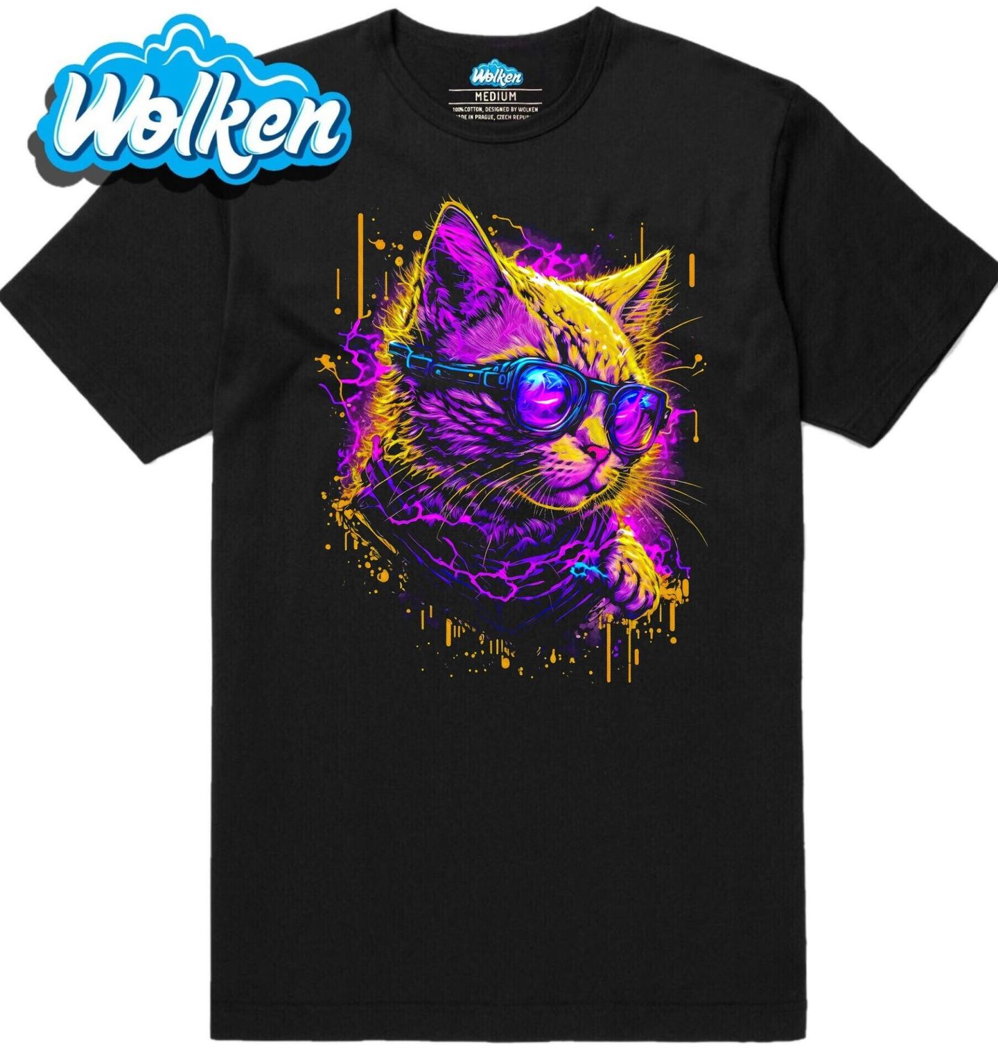 Pánské tričko Neonová Kočka v Brýlích. Kočka, která by mohla klidně řídit vesmírnou loď nebo hrát hlavní roli v cyberpunkovém filmu. Neonová kočka s elektrizující energií, stylovými brýlemi a náloží attitude, která přitahuje pozornost na první pohled. Tento motiv je ideální pro každého, kdo miluje originální kočky.