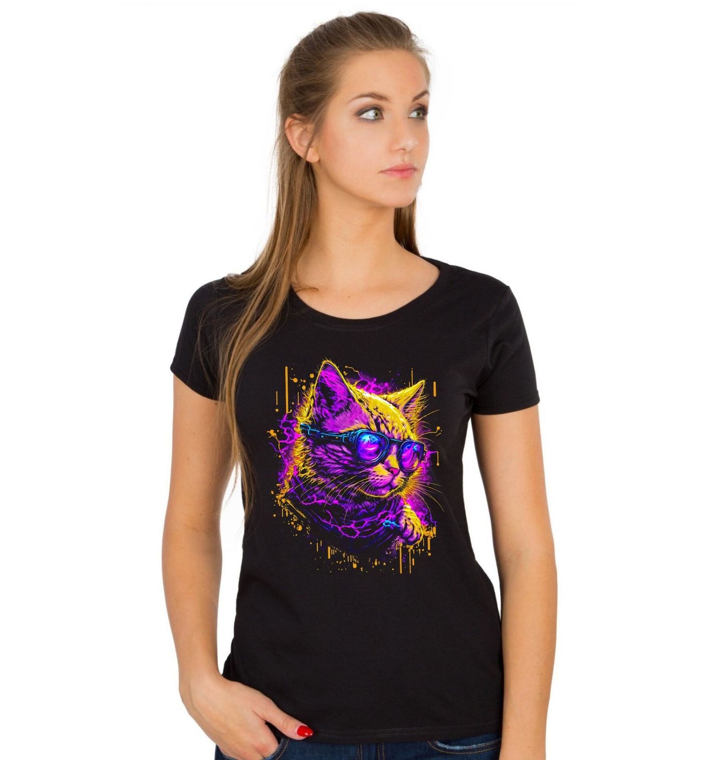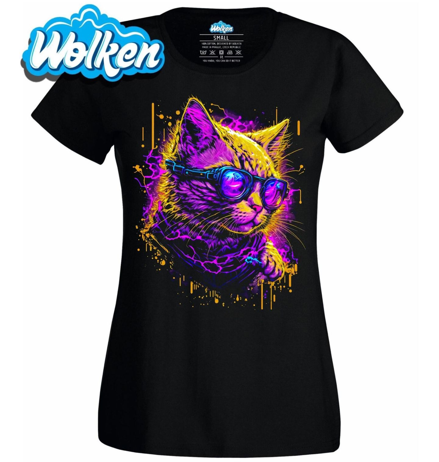 Dámské tričko Neonová Kočka v Brýlích. Kočka, která by mohla klidně řídit vesmírnou loď nebo hrát hlavní roli v cyberpunkovém filmu. Neonová kočka s elektrizující energií, stylovými brýlemi a náloží attitude, která přitahuje pozornost na první pohled. Tento motiv je ideální pro každého, kdo miluje originální kočky.