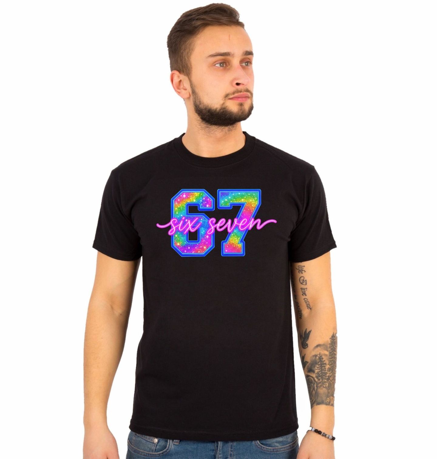 Pánské tričko Neonové Six Seven 67. Tento design s motivem, kde číslo 67 září barvami a přináší energii duhového spektra. Text „six seven“ znamená „šest sedm“ a v kombinaci s neonovým efektem vytváří moderní a výrazný vizuál. Perfektní volba pro každého, kdo miluje barvy a chce zaujmout.