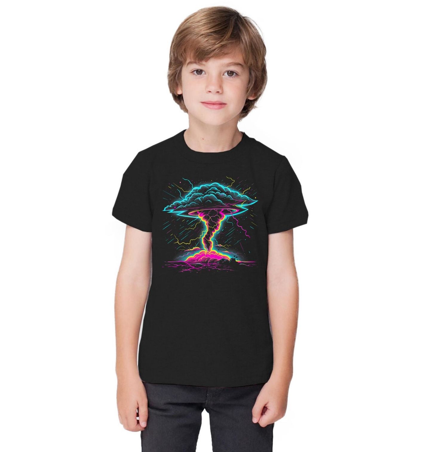 Dětské tričko Neonové Tornádo v Bouři. Výrazný a barevný fantasy design, který zachycuje sílu přírody — tornádo a divoká bouřka. Neonové barvy v odstínech modré, růžové a žluté vytváří jedinečnou, téměř futuristickou atmosféru, která okamžitě zaujme. Motiv je ideální pro každého, kdo miluje dramatické přírodní jevy, energii živlů a originální grafiku s efektním stylem.