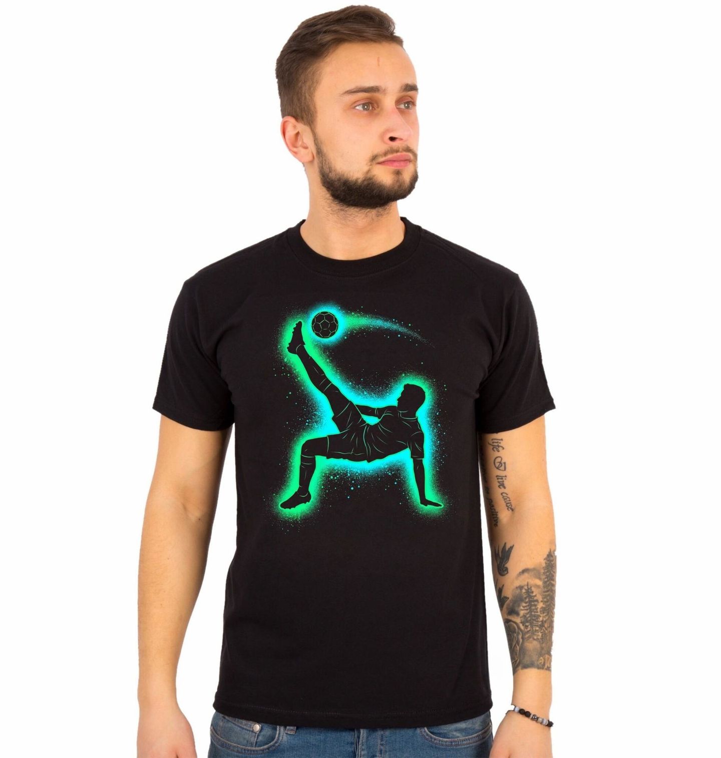 Pánské tričko Neonový Fotbalista. Dynamický motiv zachycuje siluetu hráče při efektním akrobatickém kopu, který dokonale vystihuje energii, jakou přináší fotbal jako oblíbený sport. Neonové světelné efekty dodávají designu moderní a výrazný vzhled, který okamžitě upoutá pozornost. Tento stylový motiv je ideální pro všechny, kdo milují fotbal a chtějí ukázat svou vášeň pro sport i mimo hřiště.
