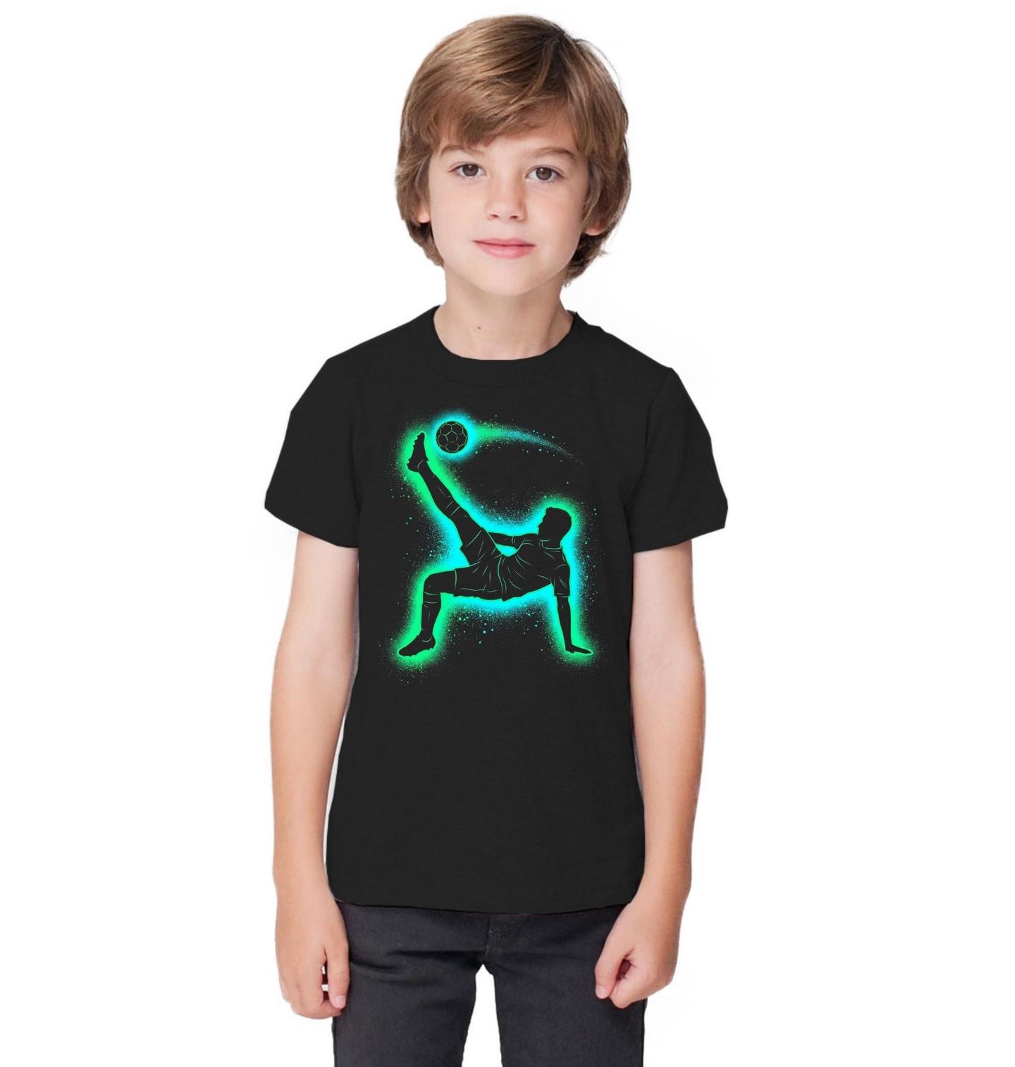 Dětské tričko Neonový Fotbalista. Dynamický motiv zachycuje siluetu hráče při efektním akrobatickém kopu, který dokonale vystihuje energii, jakou přináší fotbal jako oblíbený sport. Neonové světelné efekty dodávají designu moderní a výrazný vzhled, který okamžitě upoutá pozornost. Tento stylový motiv je ideální pro všechny, kdo milují fotbal a chtějí ukázat svou vášeň pro sport i mimo hřiště.