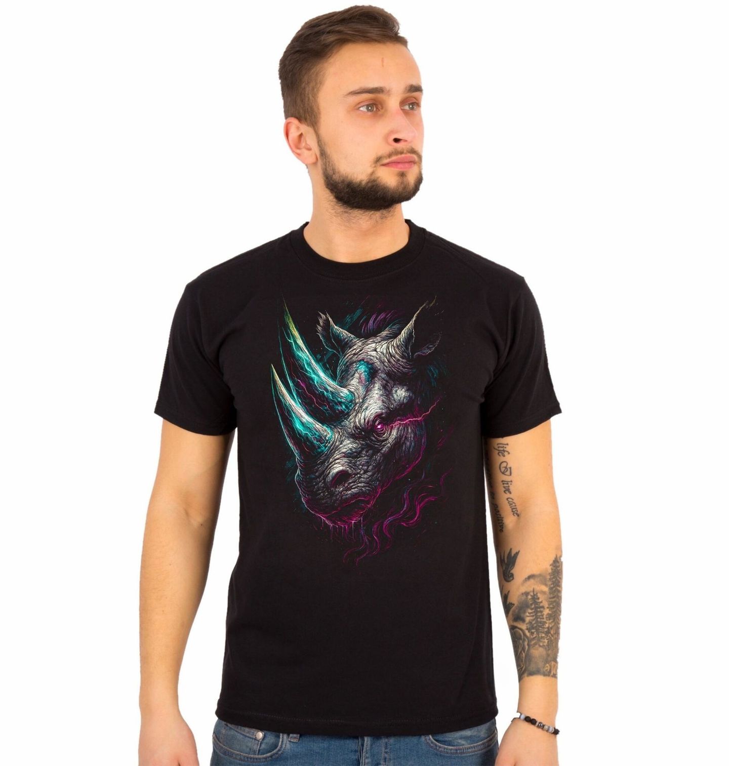 Pánské tričko Neonový Nosorožec. Drsný a výrazný motiv, který okamžitě upoutá pozornost. Dominantou designu je majestátní nosorožec, zobrazený v moderním neonovém stylu s dynamickými barvami a elektrizující energií. Tento motiv symbolizuje sílu, odhodlání a nezlomnost – vlastnosti, které nosorožec dokonale vystihuje. Detailní textura a kontrast mezi temným pozadím a zářivými neonovými prvky dodávají motivu futuristický vzhled.