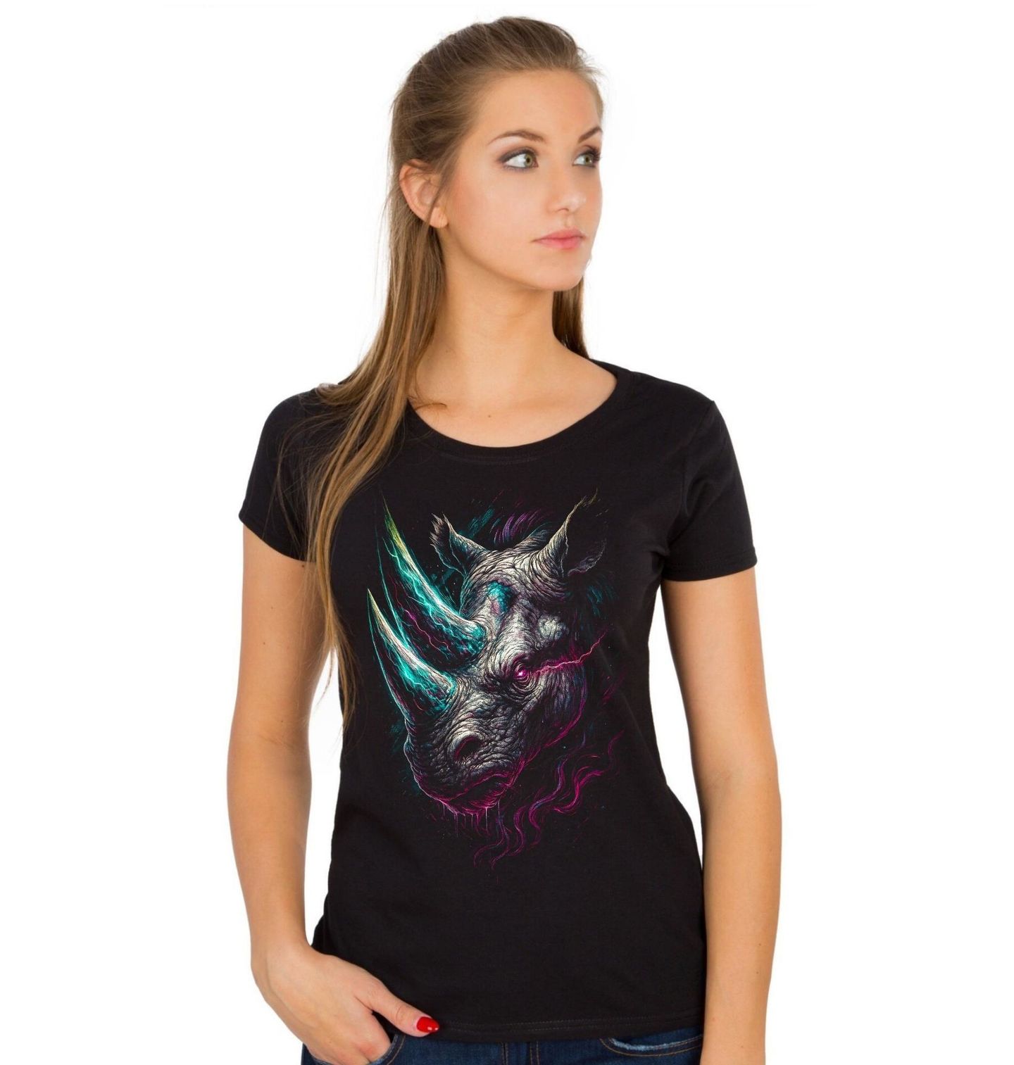 Dámské tričko Neonový Nosorožec. Drsný a výrazný motiv, který okamžitě upoutá pozornost. Dominantou designu je majestátní nosorožec, zobrazený v moderním neonovém stylu s dynamickými barvami a elektrizující energií. Tento motiv symbolizuje sílu, odhodlání a nezlomnost – vlastnosti, které nosorožec dokonale vystihuje. Detailní textura a kontrast mezi temným pozadím a zářivými neonovými prvky dodávají motivu futuristický vzhled.