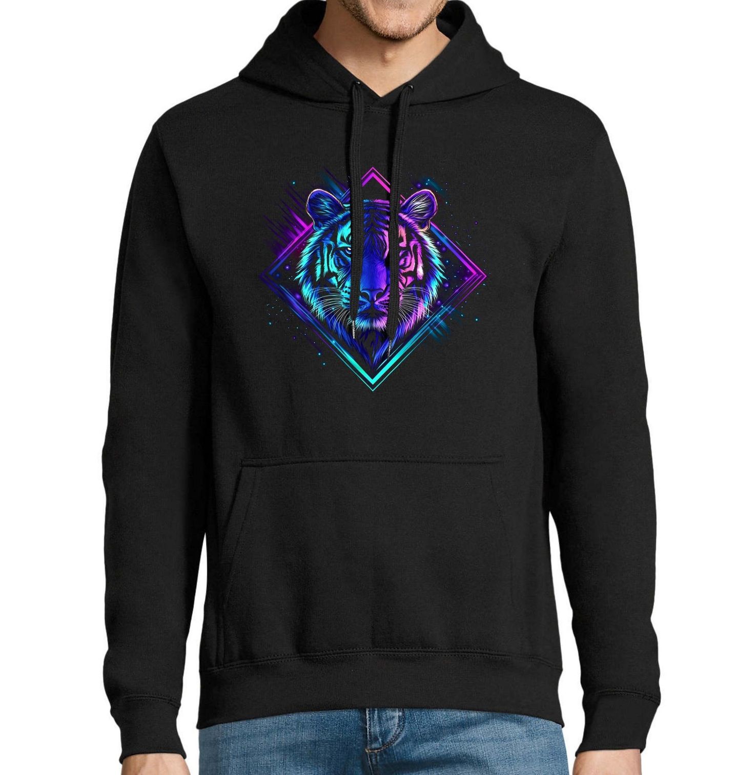 Pánská mikina Neonový Tygr. Tento design spojuje divokost tygra s moderními neonovými barvami a geometrickými tvary. S kontrastními tóny modré, fialové a růžové, tento motiv evokuje energii a sílu, kterou tygr představuje, a zároveň přináší futuristický a umělecký vzhled.