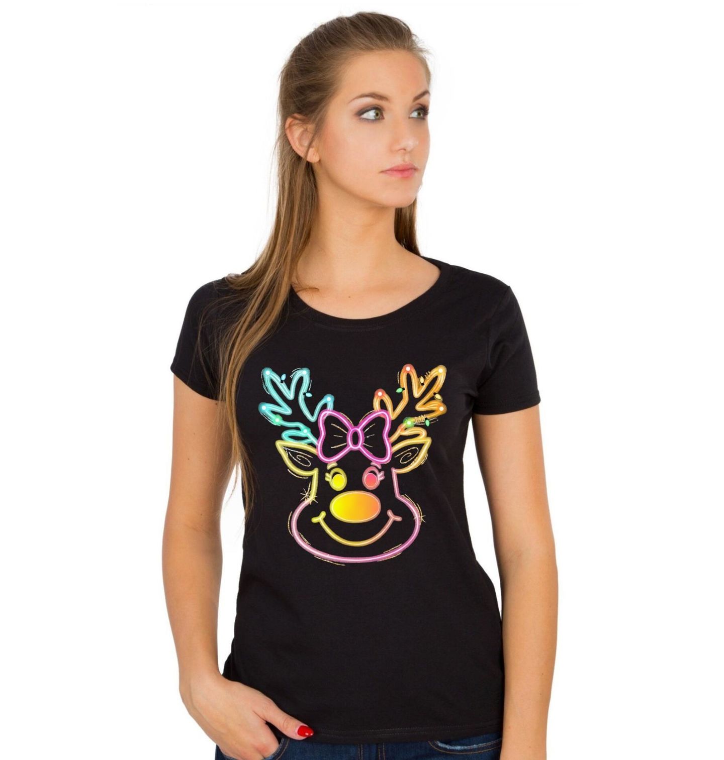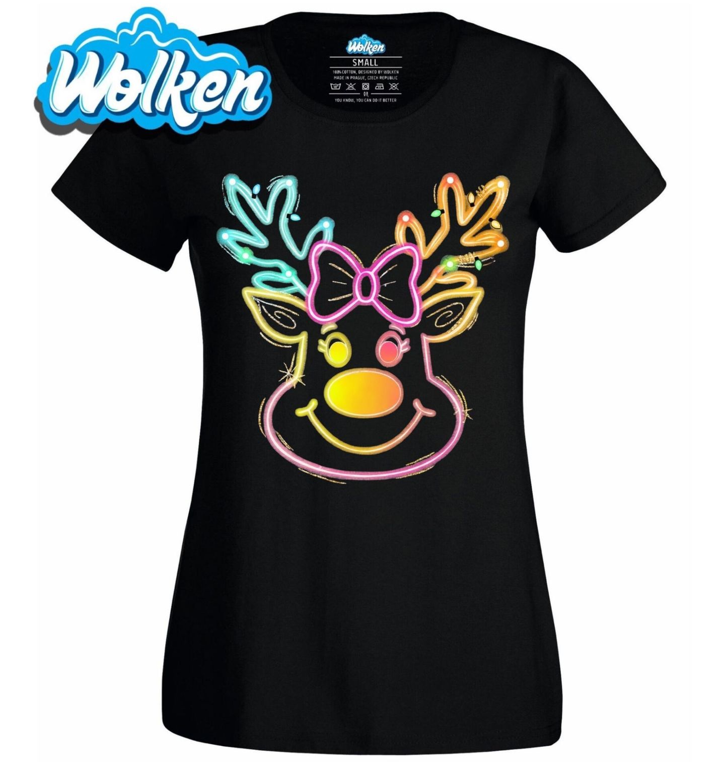 Dámské tričko Neonový Vánoční Sob. Zářivý motiv neonového soba s veselým úsměvem, výrazným nosem a roztomilou mašlí rozzáří každé Vánoce. Tento barevný design ve stylu svítící dekorace spojuje moderní estetiku s klasickým vánočním symbolem – sobem.