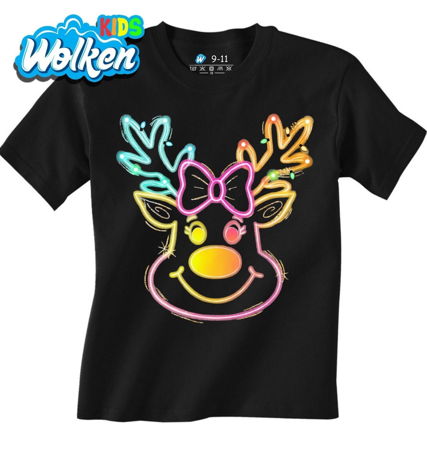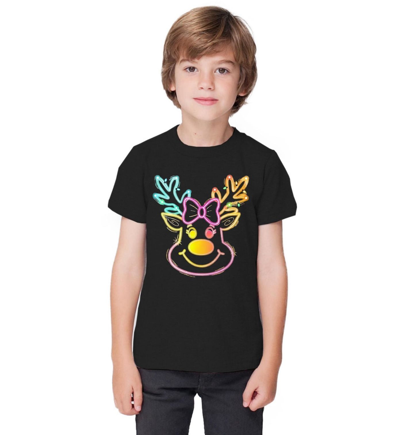 Dětské tričko Neonový Vánoční Sob. Zářivý motiv neonového soba s veselým úsměvem, výrazným nosem a roztomilou mašlí rozzáří každé Vánoce. Tento barevný design ve stylu svítící dekorace spojuje moderní estetiku s klasickým vánočním symbolem – sobem.