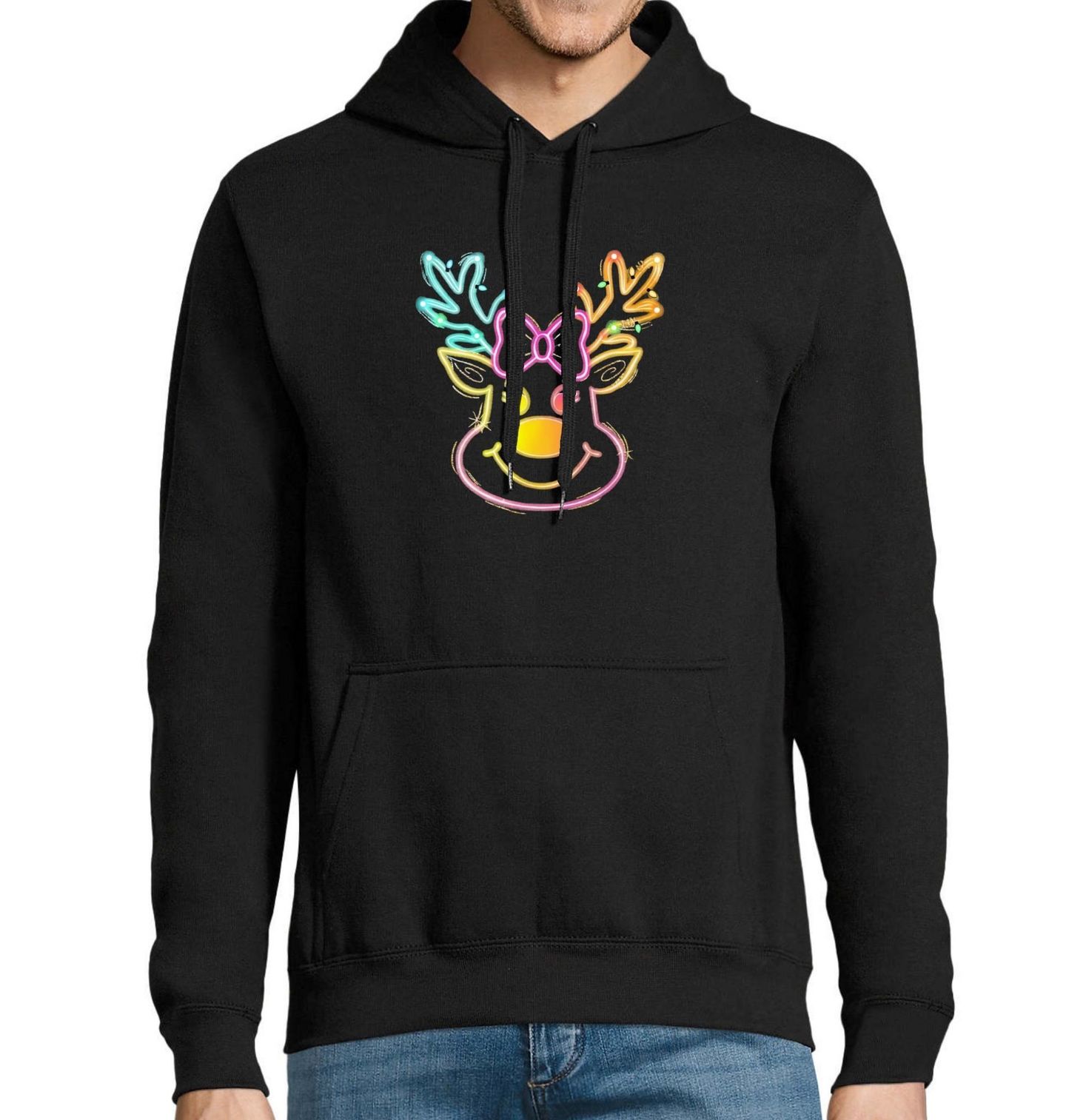 Pánská mikina Neonový Vánoční Sob. Zářivý motiv neonového soba s veselým úsměvem, výrazným nosem a roztomilou mašlí rozzáří každé Vánoce. Tento barevný design ve stylu svítící dekorace spojuje moderní estetiku s klasickým vánočním symbolem – sobem.