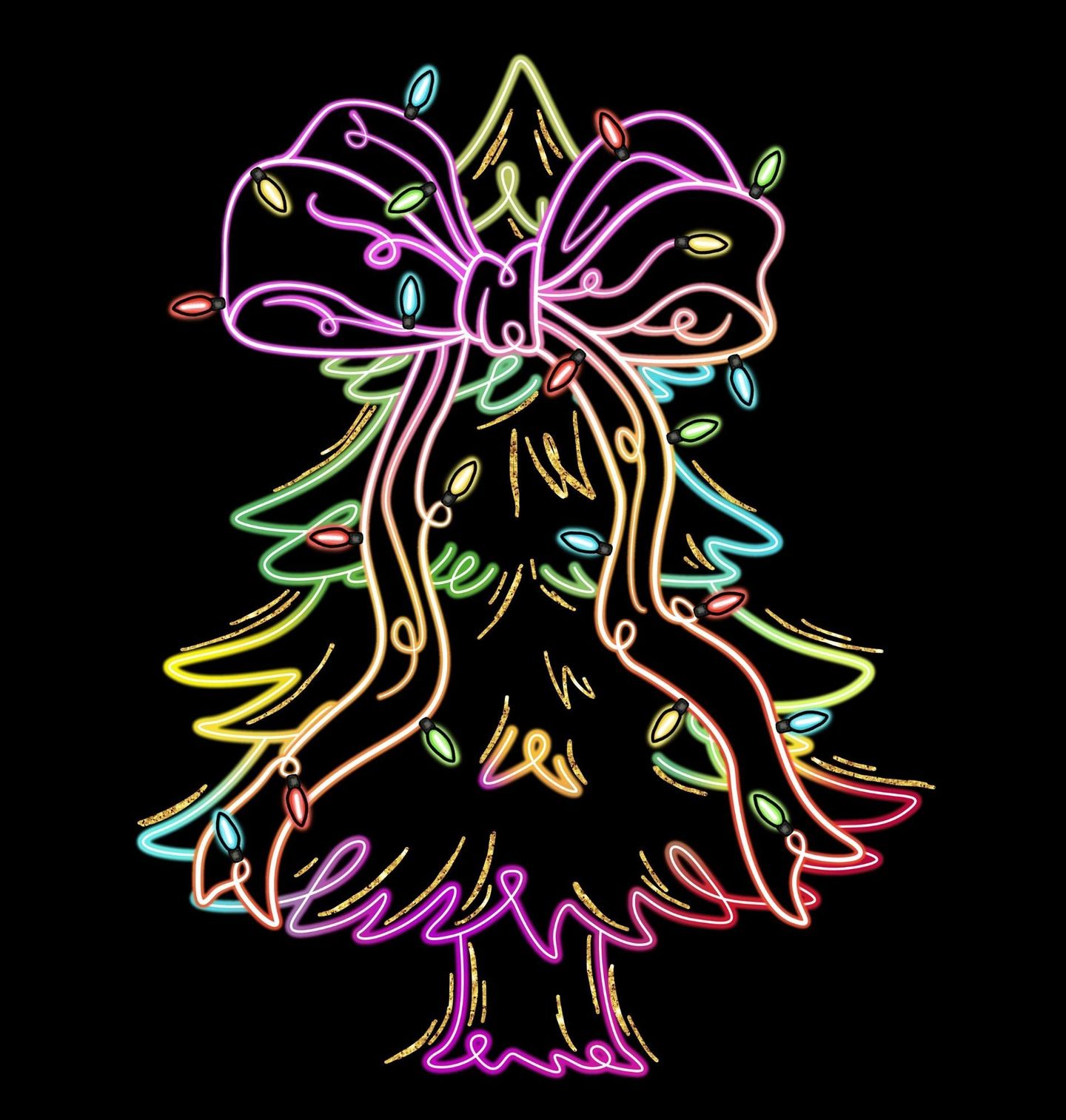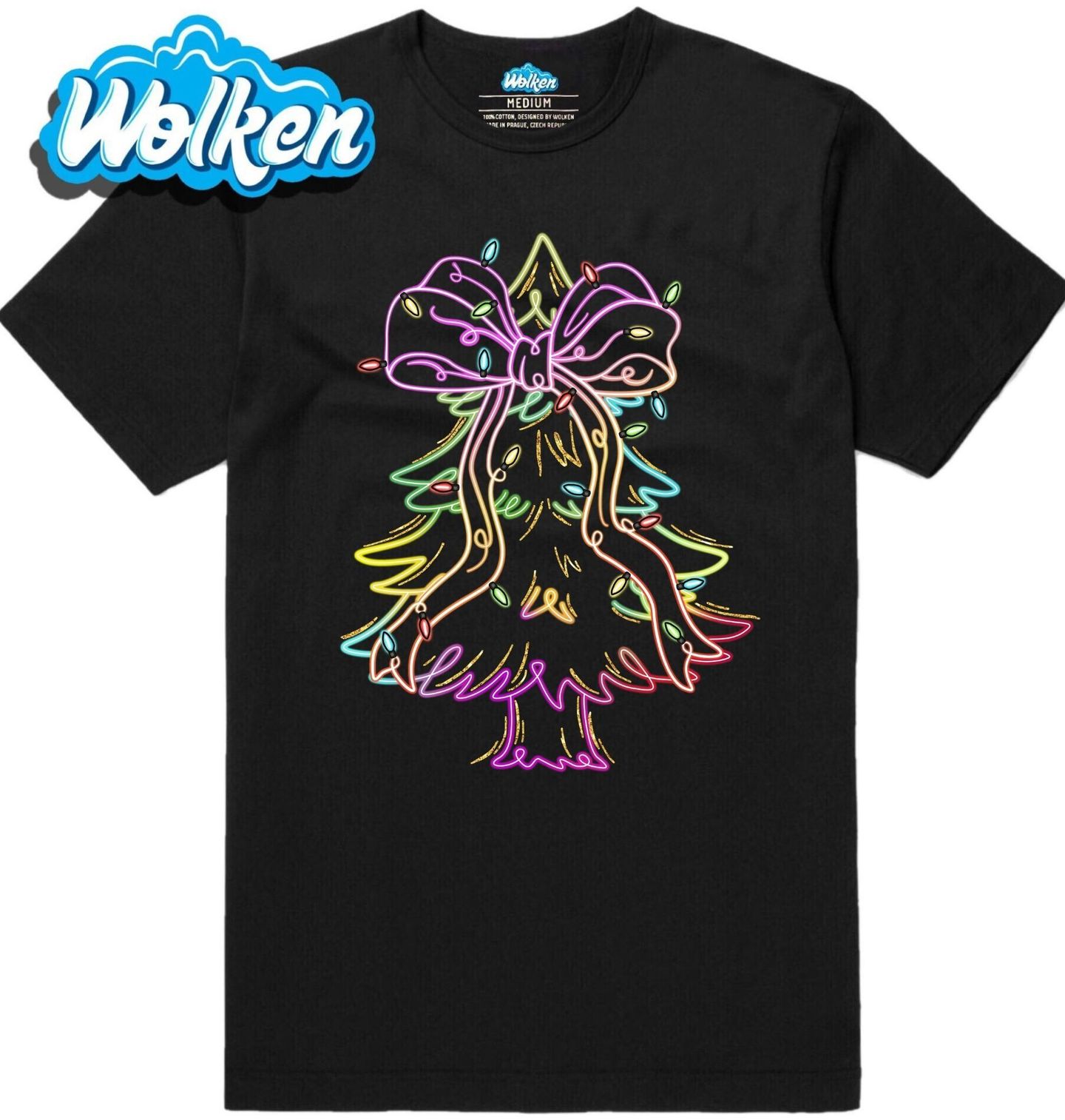 Pánské tričko Neonový Vánoční Stromeček. Originální neonový motiv vánočního stromečku ozdobeného světýlky a výraznou mašlí přináší moderní pojetí tradičního symbolu. Díky zářivým barvám a efektu svítících kontur působí design energicky a hravě. Vánoce v tomto stylu získávají jedinečný vizuální rozměr, který potěší všechny milovníky nevšedních a barevných dekorací.