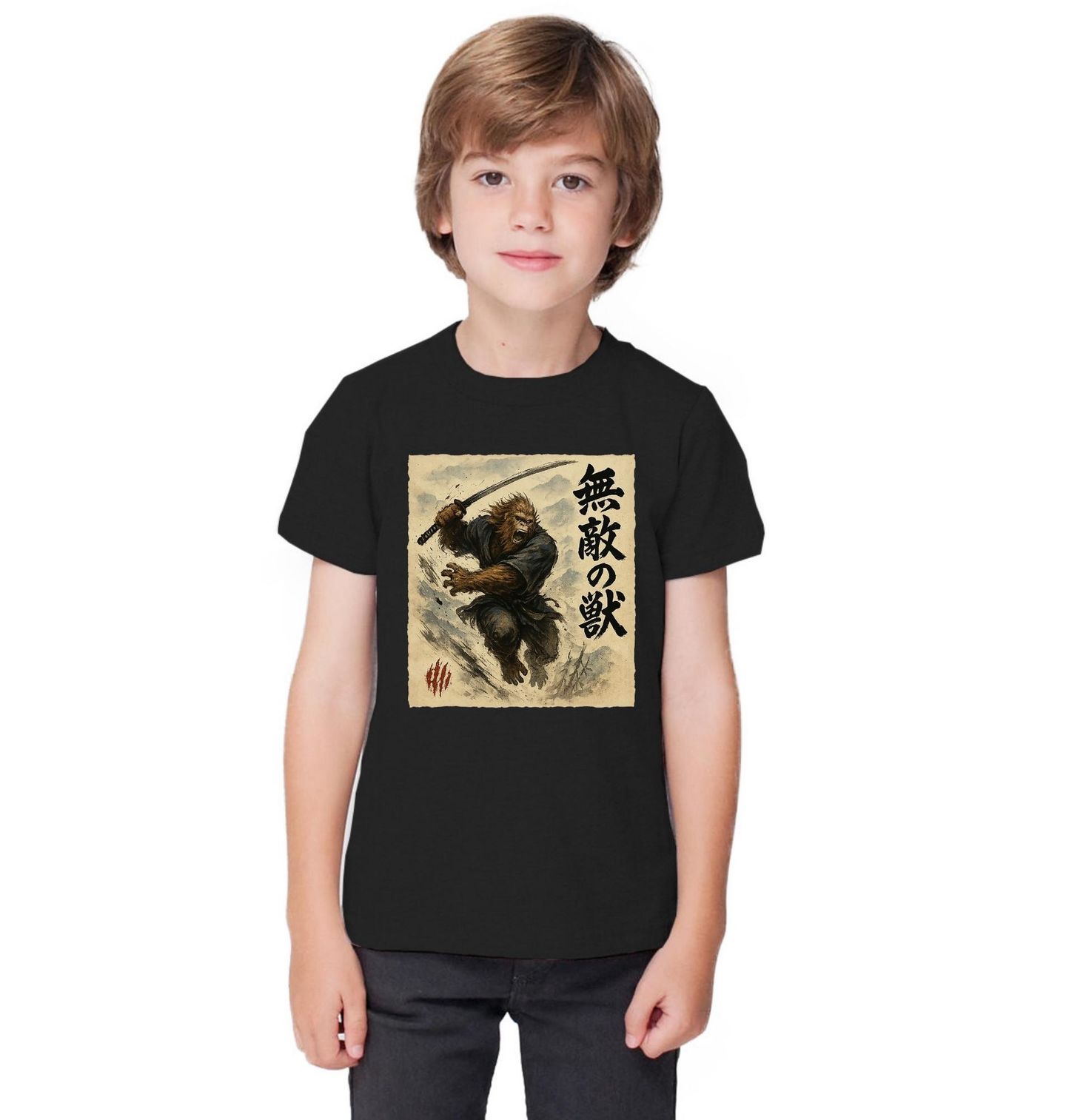 Dětské tričko Neporazitelná Gorila Samuraj s Katanou. Tento motiv zachycuje zuřivého válečníka, kterým je divoká opice držící katanu v bojovém výskoku. Styl ilustrace připomíná tradiční malby z Japonsko – s dramatickým štětcovým rukopisem a starým papírem. Znaky symbolizující Japonsko říkají: 無敵の獣 – „Neporazitelná bestie“.
