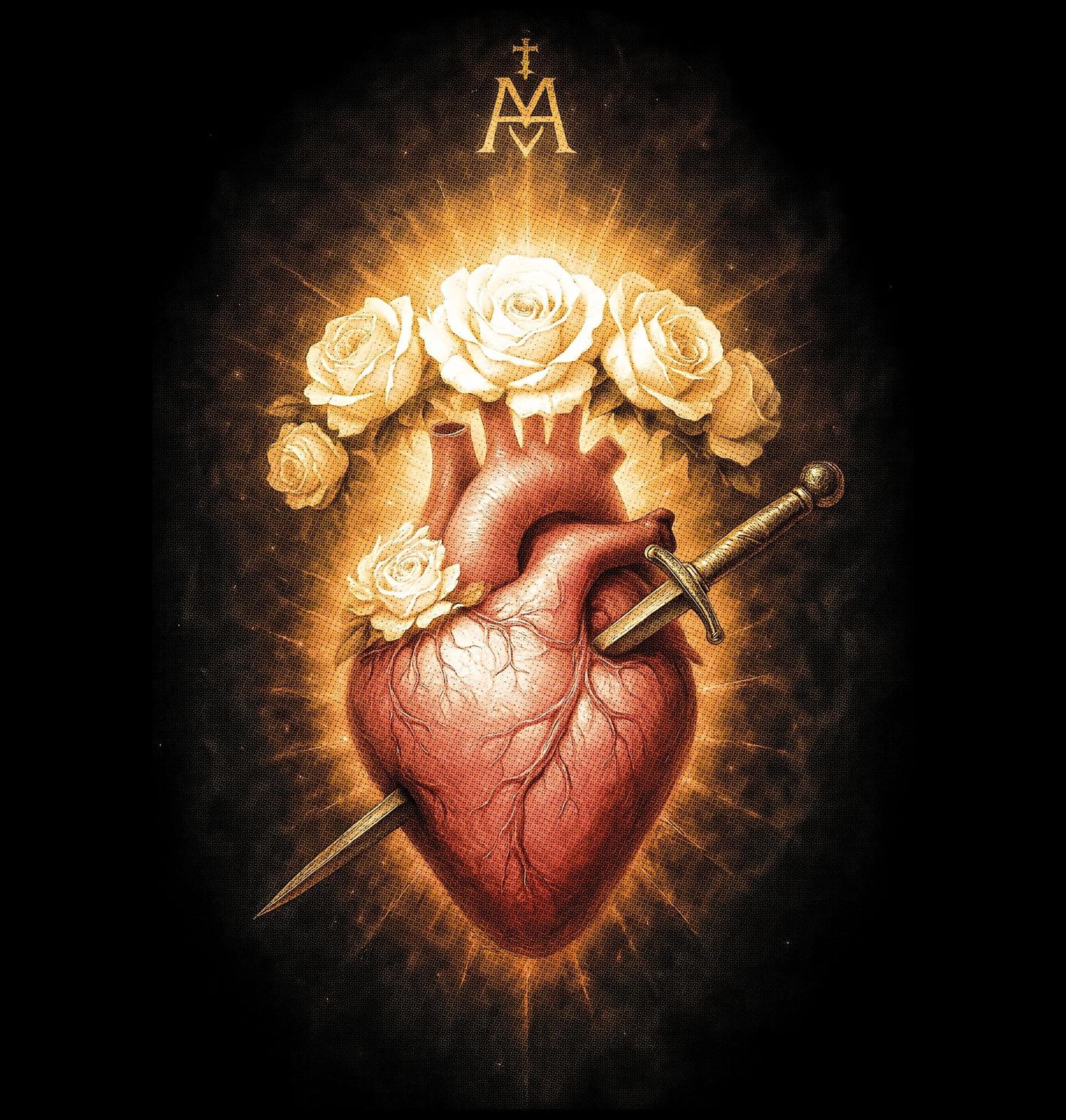Dámské tričko Neposkvrněné Srdce Panny Marie. Srdce probodnuté mečem je předmětem kultu římskokatolické církve o vnitřním životě Marie, jejích radostech a starostech, jejích ctnostech a skryté dokonalosti a především o její panenské lásce k Bohu Otci, mateřské lásce k jejímu synu Ježíši Kristu. Celek hluboce odkazuje na křesťanství, kde je utrpení chápáno jako cesta k vykoupení a naději.