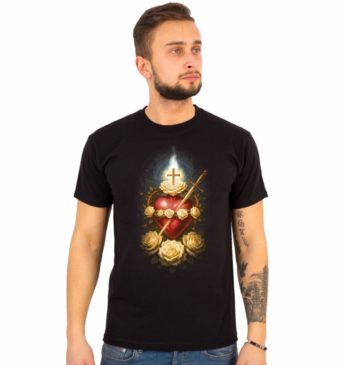 Pánské tričko Neposkvrněné Srdce Panny Marie mezi Růžemi. Celý výjev vychází z tradice křesťanství, kde Srdce představuje dokonalou důvěru v Boží vůli a lásku k lidstvu. Rudé srdce obklopené bílými růžemi vyjadřuje neposkvrněnost a mateřskou něhu, zatímco meč probodávající srdce připomíná bolest a oběť spojenou s Mariiným životem.