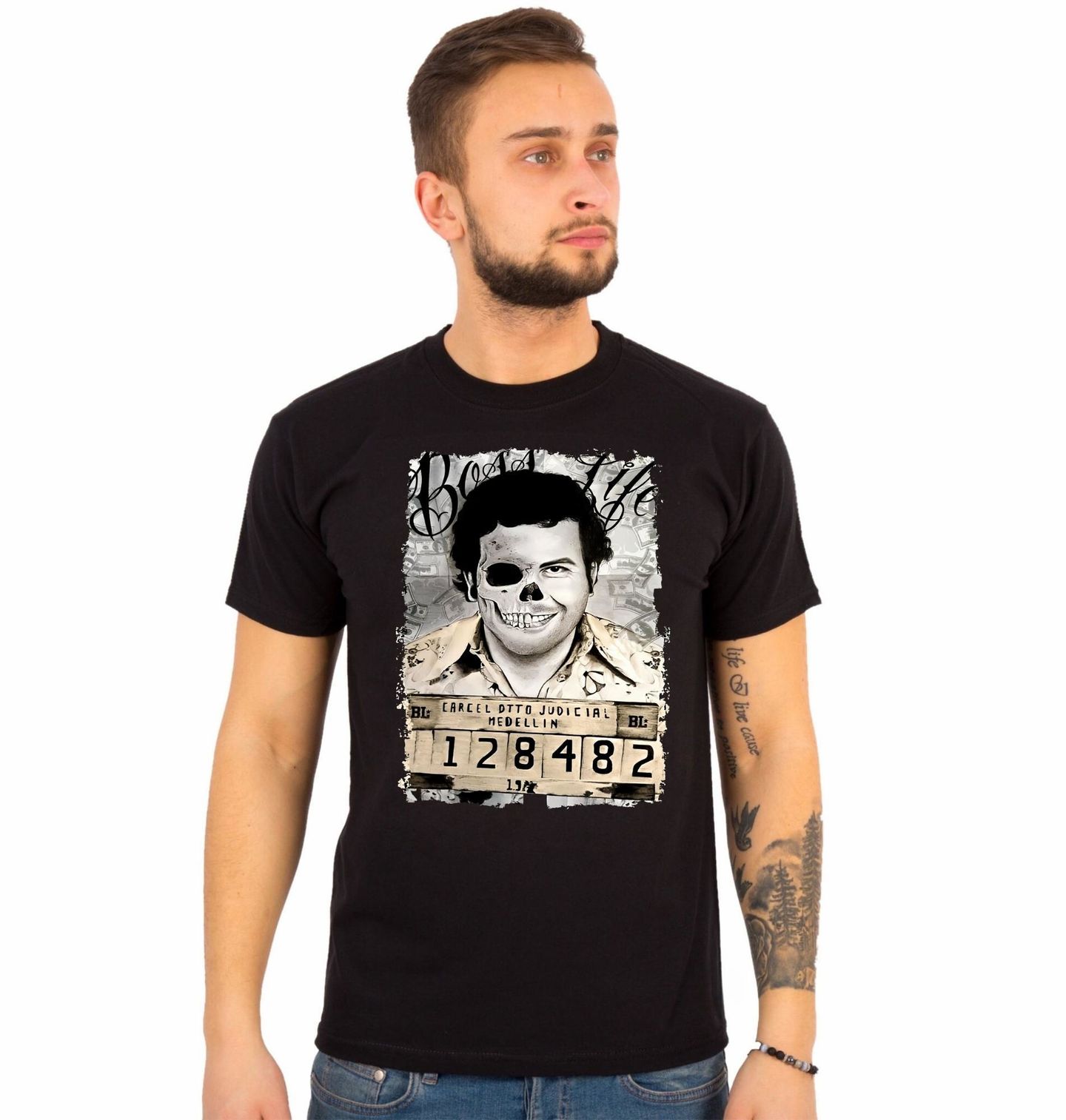 Pánské tričko Nesmrtelný Pablo Escobar. Odhalte temnou legendu kolumbijského podsvětí. Motiv zpracovaný ve stylu vězeňské fotografie s číslem 128482, doplněný o dolary v pozadí a nápisem Carcel Judicial Medellín, podtrhuje Escobarův život mezi drogami, mocí a smrtí. Kostlivec a živý výraz ve tváři vytvářejí silný vizuální kontrast, který z tohoto trička dělá skutečný statement piece.