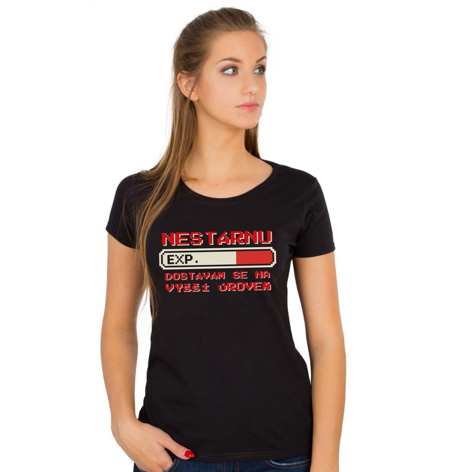 Dámské tričko Nestárnu - Dostávám se na Vyšší Úroveň. Motiv je inspirovaný retro světem videohry. Uprostřed designu je ikonický ukazatel EXP bodů, který se postupně zaplňuje, doplněný nápisem. Celý potisk připomíná staré pixelové hry a skvěle vystihuje styl, kterým žije každý gamer. Design vtipně ukazuje, že místo stárnutí jen sbíráme zkušenosti a levelujeme dál.