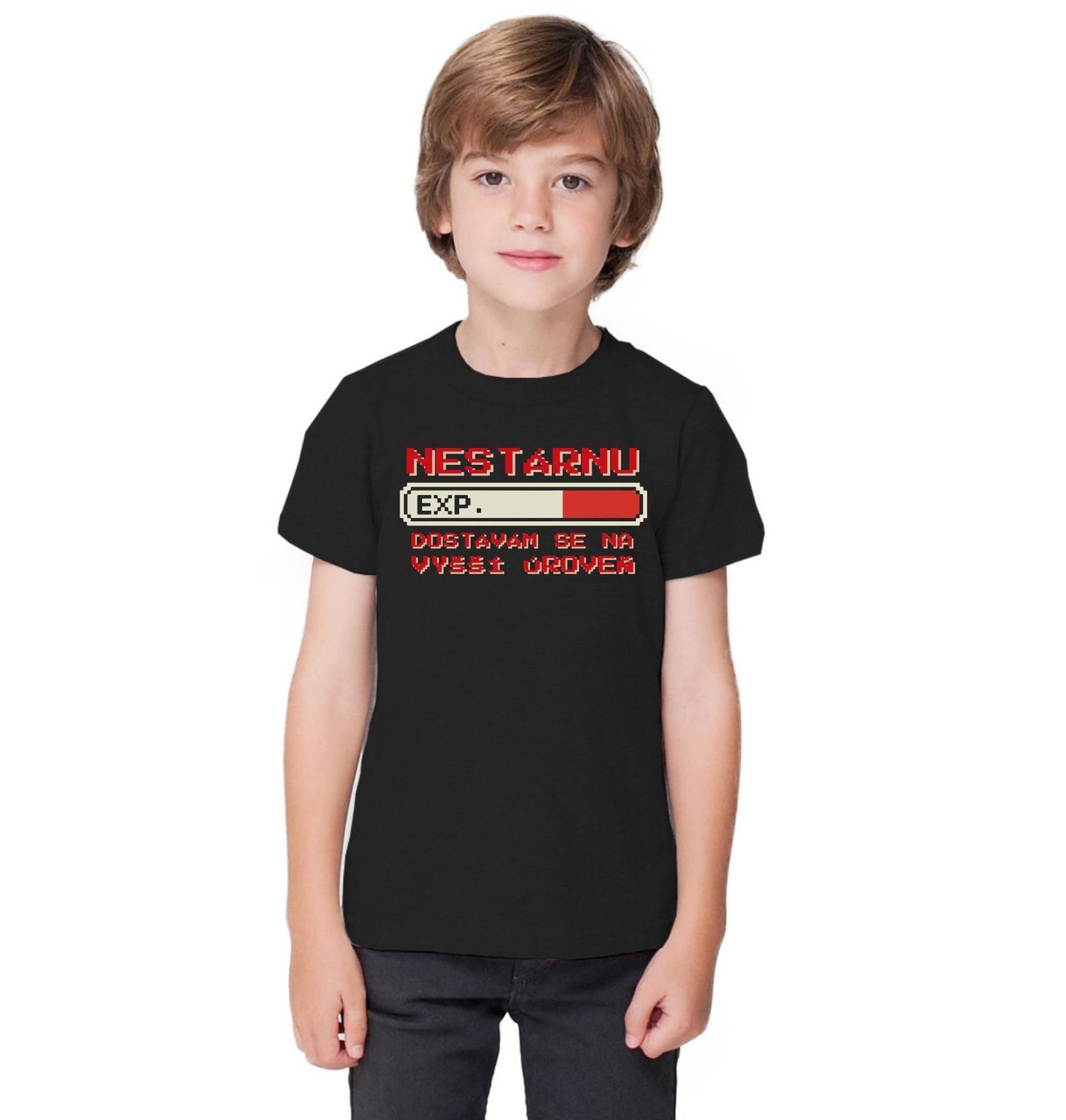 Dětské tričko Nestárnu - Dostávám se na Vyšší Úroveň. Motiv je inspirovaný retro světem videohry. Uprostřed designu je ikonický ukazatel EXP bodů, který se postupně zaplňuje, doplněný nápisem. Celý potisk připomíná staré pixelové hry a skvěle vystihuje styl, kterým žije každý gamer. Design vtipně ukazuje, že místo stárnutí jen sbíráme zkušenosti a levelujeme dál.