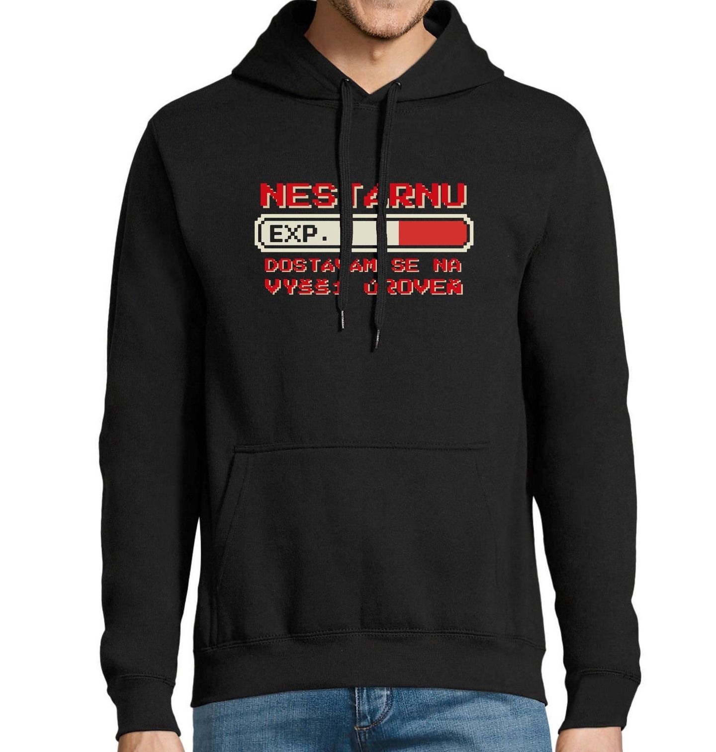 Pánská mikina Nestárnu - Dostávám se na Vyšší Úroveň. Motiv je inspirovaný retro světem videohry. Uprostřed designu je ikonický ukazatel EXP bodů, který se postupně zaplňuje, doplněný nápisem. Celý potisk připomíná staré pixelové hry a skvěle vystihuje styl, kterým žije každý gamer. Design vtipně ukazuje, že místo stárnutí jen sbíráme zkušenosti a levelujeme dál.