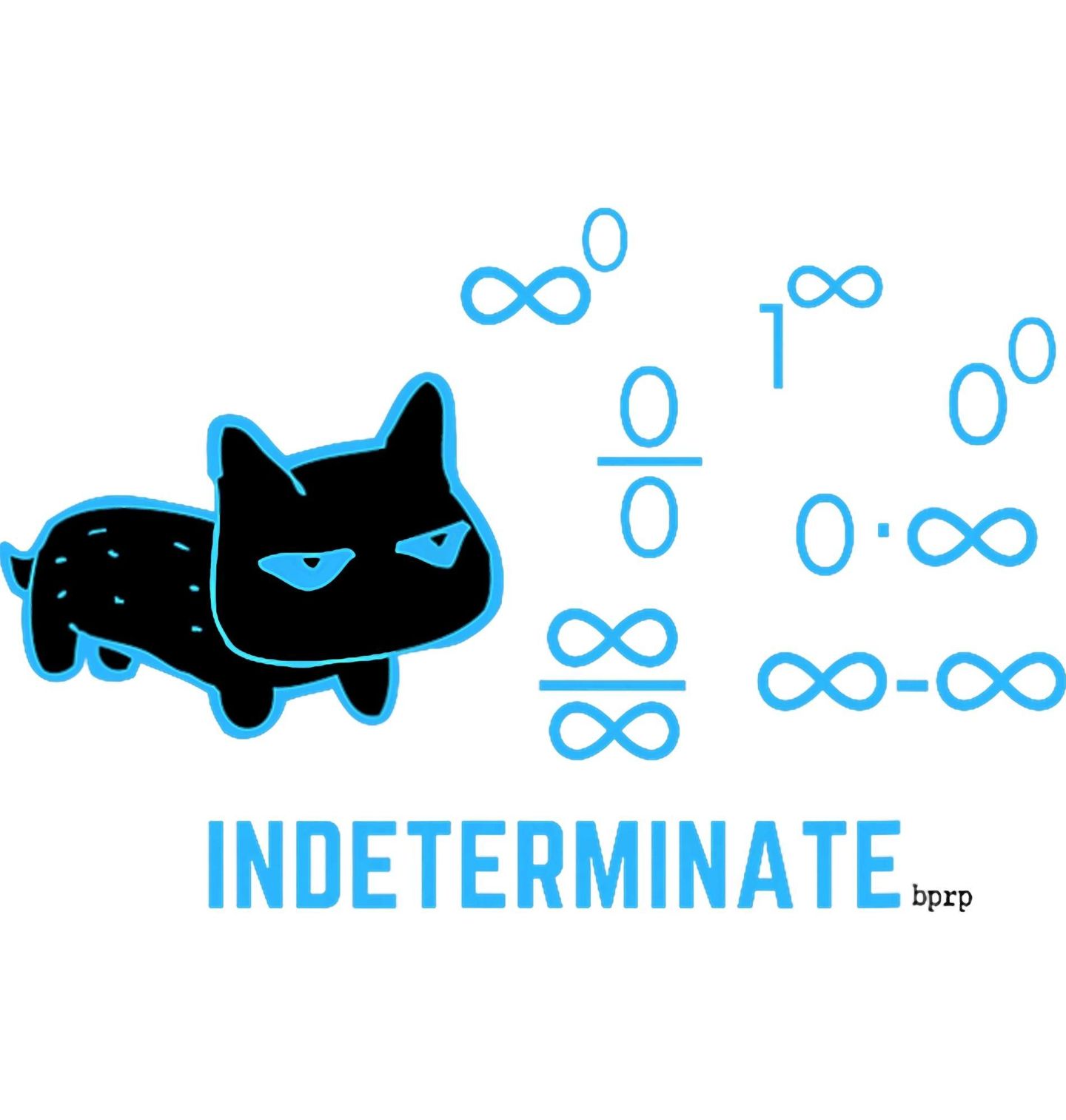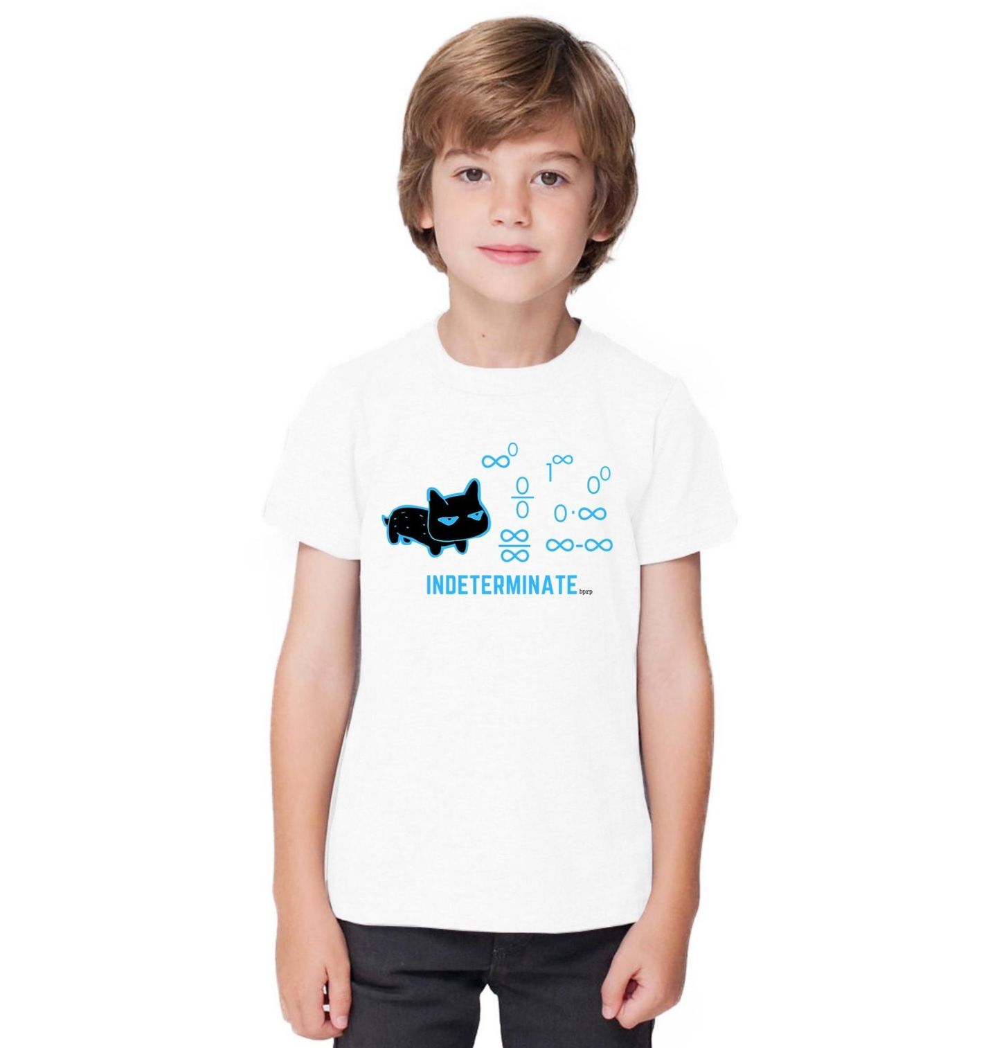 Dětské tričko Neurčité formy Indeterminate bprp. Tenhle originální motiv spojí svět humoru a vědy do jediné ilustrace. Hlavní roli tu hraje stylizovaná kočka, která je obklopená slavnými „neurčitými výrazy“ z matematiky – jako je 0/0, ∞/∞, 1^∞, 0·∞ a další. Pod motivem je anglický nápis INDETERMINATE (tedy „neurčitý“). „bprp“ je zkratka pro BlackPenRedPen - známý thajvanský YouTube kanál o matematice.