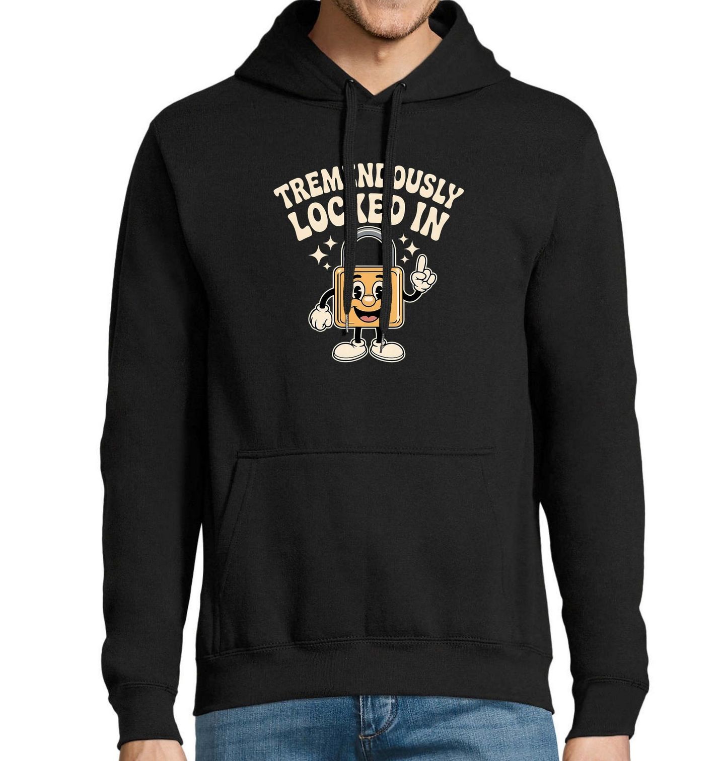 Pánská mikina Neuvěřitelně soustředěný Tremendously Locked In. Vtipný a pozitivní motiv s kresleným zámkem s úsměvem a nápisem „Tremendously Locked In“. Tento design vyjadřuje, že jsi plně soustředěný, odhodlaný a „uzamčený“ do toho, co děláš – ať už jde o práci, studium, trénink nebo koníčky.