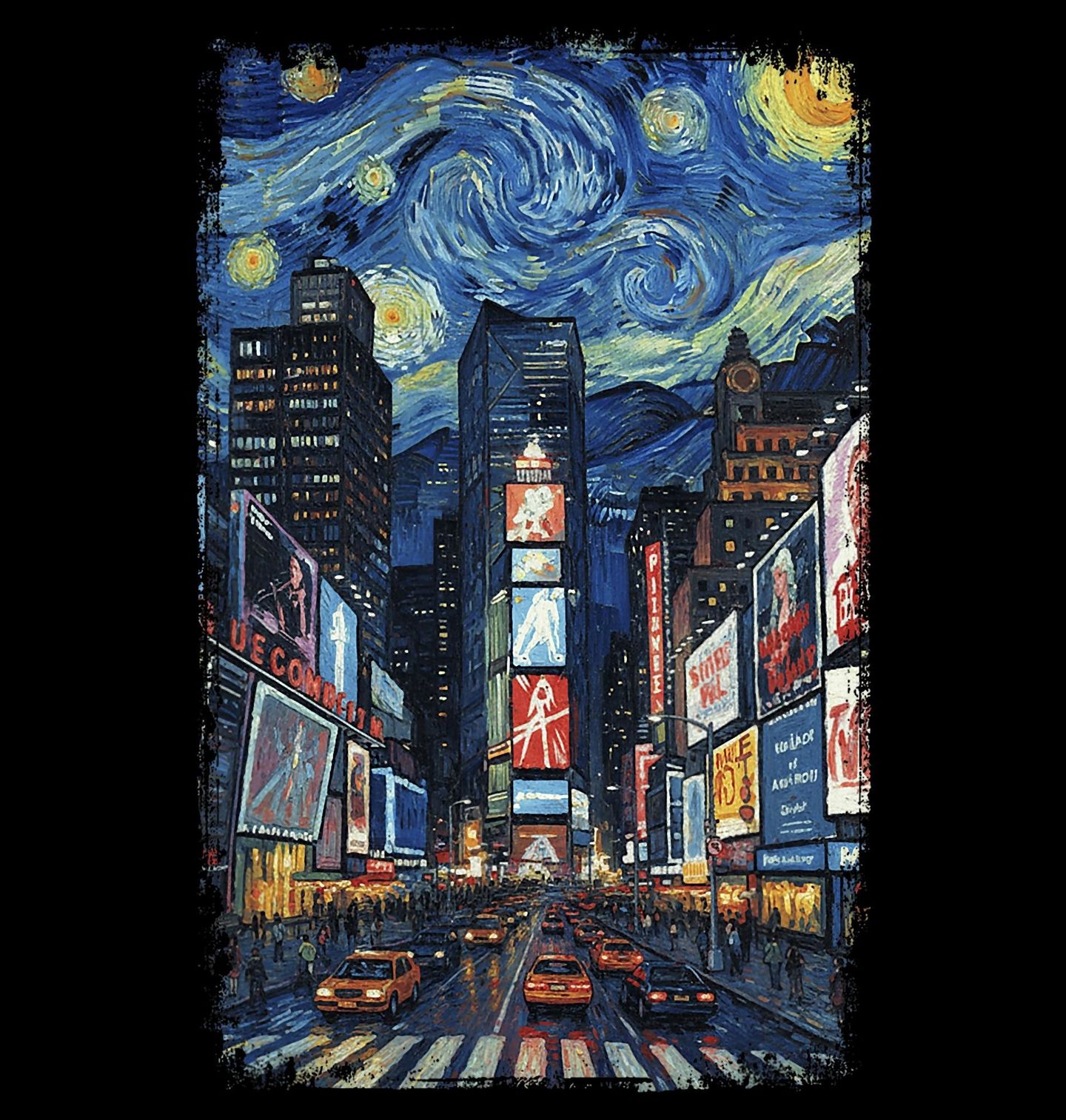 Dětské tričko New York Times Square ve Hvězdné noci. Originální motiv, který spojuje slavný obraz Hvězdná noc od Vincent van Gogha s ikonickým rušným centrem New Yorku – Times Square. Tento design je ideální pro milovníky umění, cestování i moderního městského života. Pokud tě fascinuje Vincent van Gogh a jeho Hvězdná noc, tenhle motiv si zamiluješ!