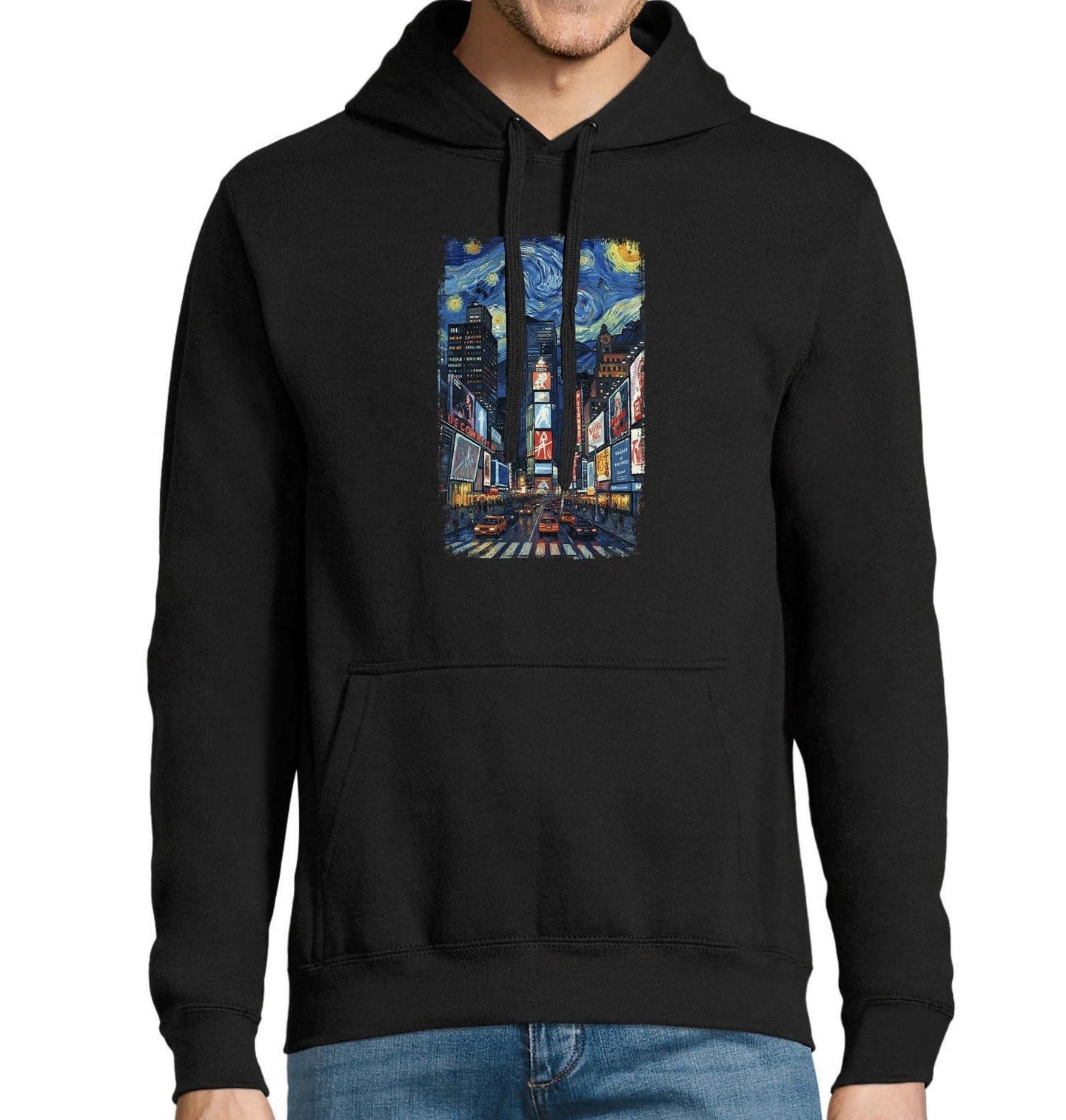 Pánská mikina New York Times Square ve Hvězdné noci. Originální motiv, který spojuje slavný obraz Hvězdná noc od Vincent van Gogha s ikonickým rušným centrem New Yorku – Times Square. Tento design je ideální pro milovníky umění, cestování i moderního městského života. Pokud tě fascinuje Vincent van Gogh a jeho Hvězdná noc, tenhle motiv si zamiluješ!