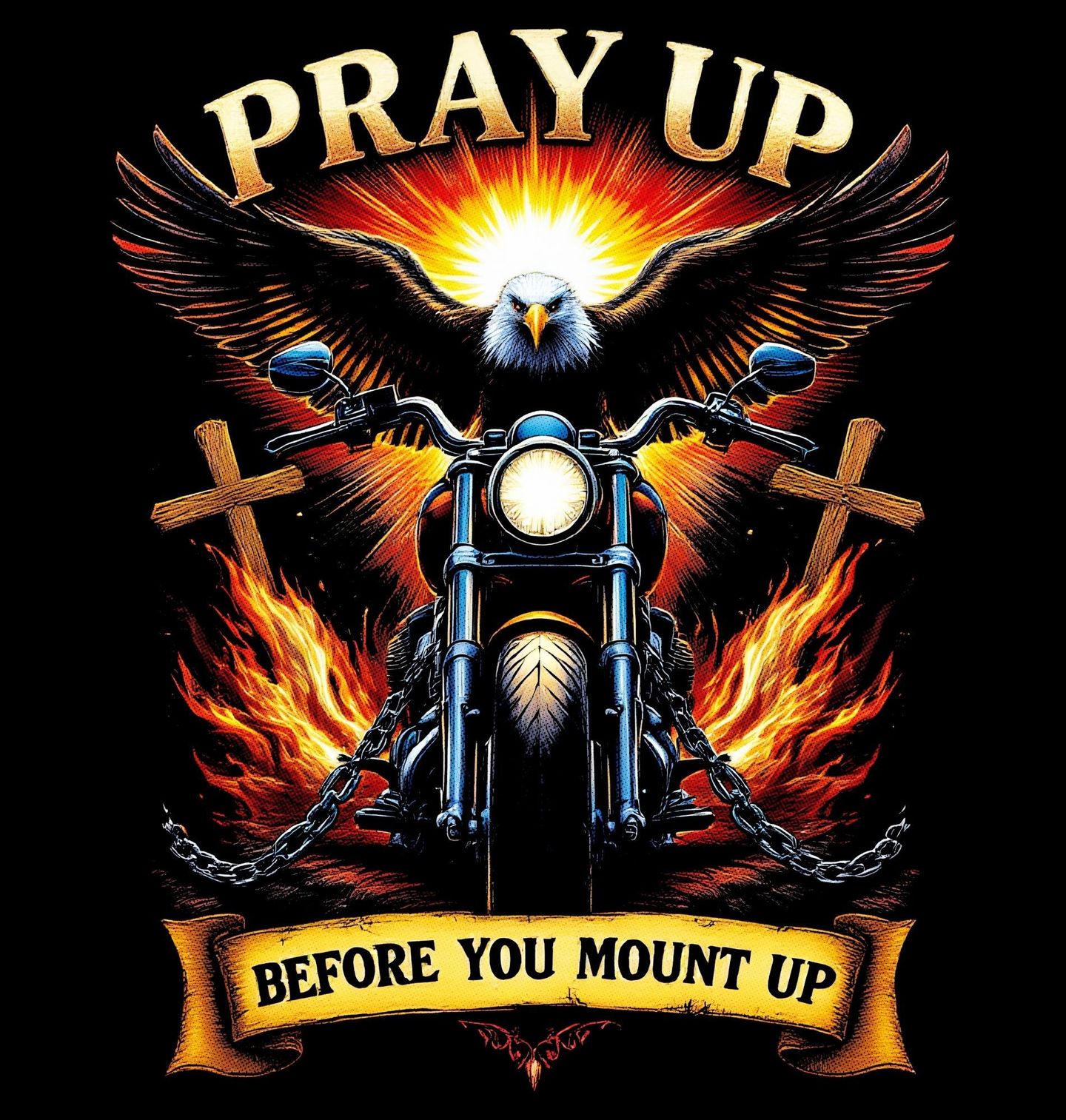 Dámské tričko Než nasedneš, pomodli se. Silný motorkářský motiv s duchovním přesahem, kde majestátní orel rozepíná křídla a burácející motorka obklopená ohněm. Dva kříže symbolizují víru a ochranu na každé jízdě. Nápis na motivu hlásá: „PRAY UP BEFORE YOU MOUNT UP“ – „Pomodli se, než nasedneš.“