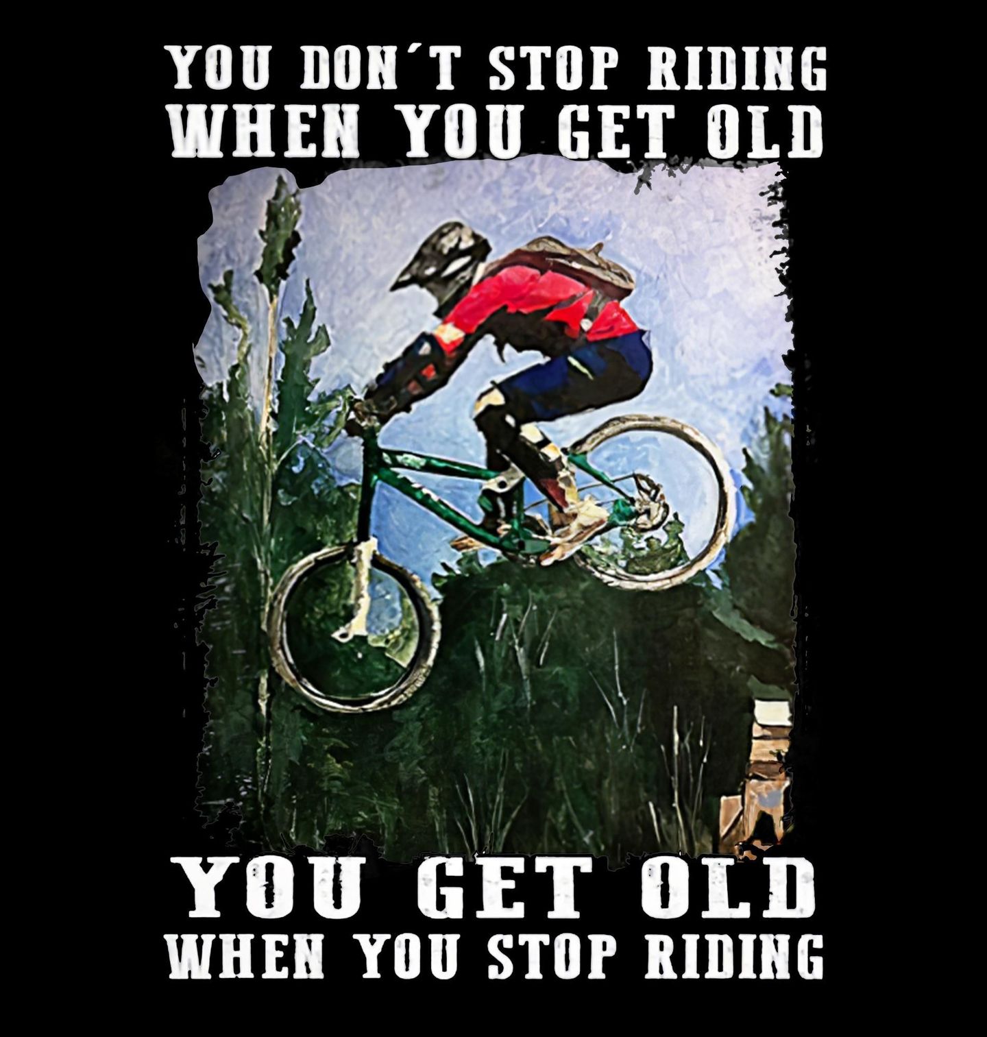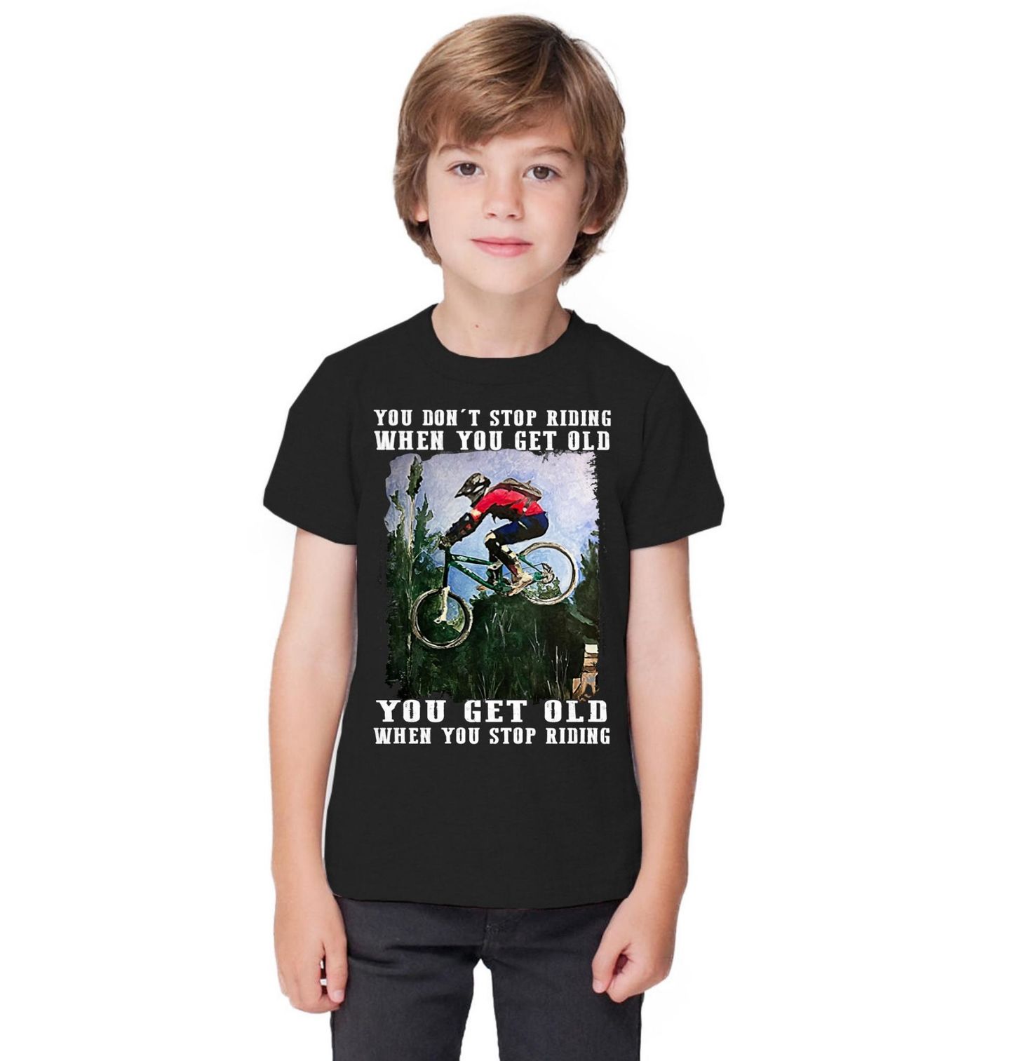 Dětské tričko Nezastavíš, když Zestárneš. Motivační design obsahuje text „YOU DON’T STOP RIDING WHEN YOU GET OLD – YOU GET OLD WHEN YOU STOP RIDING“ (Nepřestaneš jezdit, když zestárneš – zestárneš, když přestaneš jezdit). Perfektní pro každého, kdo bere cyklistiku jako celoživotní vášeň.